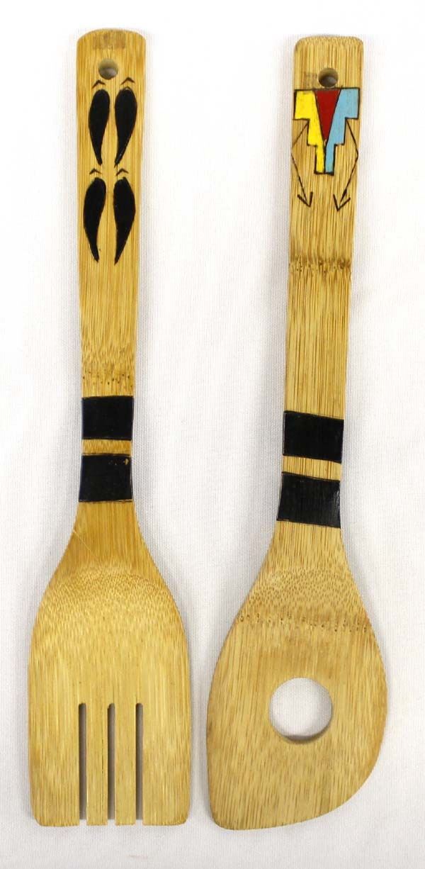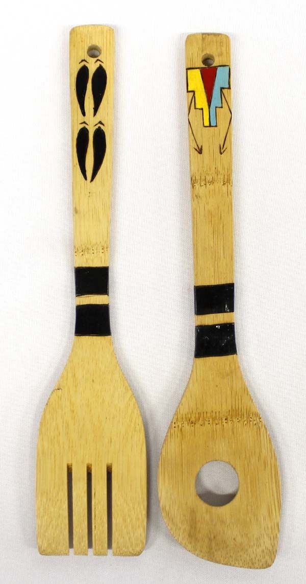 Native American Hopi Hand Painted Wood Spaghetti Spoon & Fork, measures 2.5'' x 12''