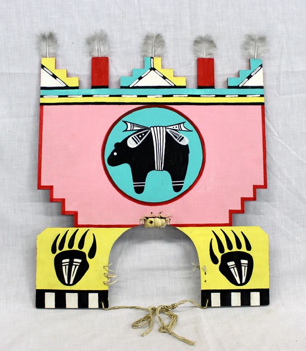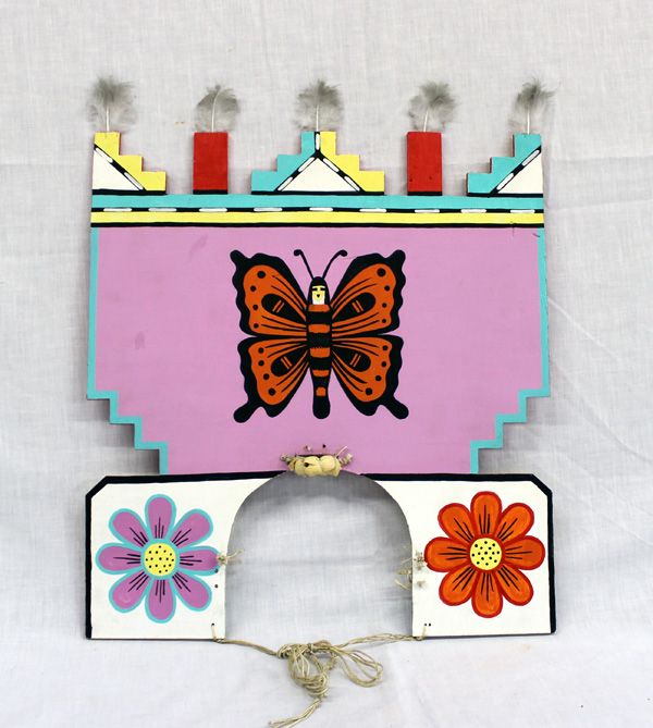 From the Nick and Suzanne Nicholas Collection we have a Hopi Butterfly Maiden Tableta, measures 17.5''H (includes feathers) x 14''W, small braided jute ring to protect top of head, gorgeously painted in lavender-orange-black-yellow-white-red and pink, one side depicts the butterfly maiden and two flowers while the other side has a bear fetish with powerpack and two bearpaws, tabletas ( dance tablets ) are worn by young women during the butterfly dance, a social dance held every August. Each headdress is one-of-a-kind, incorporating various Hopi symbols and motifs. Tabletas are usually handmade by a girl's male dance partner.