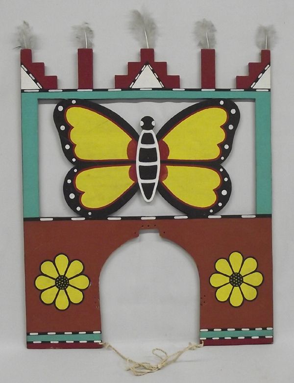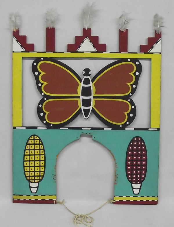 From the Nick and Suzanne Nicholas Collection we have a Hopi Handpainted Tableta Headdress, measures 20''H (includes feathers) x 15.5''W, vibrantly painted in hues of yellow-chocolate brown-turquoise-white-and black, feather accents, small braided jute ring to protect top of head, features butterfly and flowers on one side and butterfly and two ears of corn on the other, tabletas ( dance tablets ) are worn by young women during the butterfly dance, a social dance held every August. Each headdress is one-of-a-kind, incorporating various Hopi symbols and motifs. Tabletas are usually handmade by a girl's male dance partner.