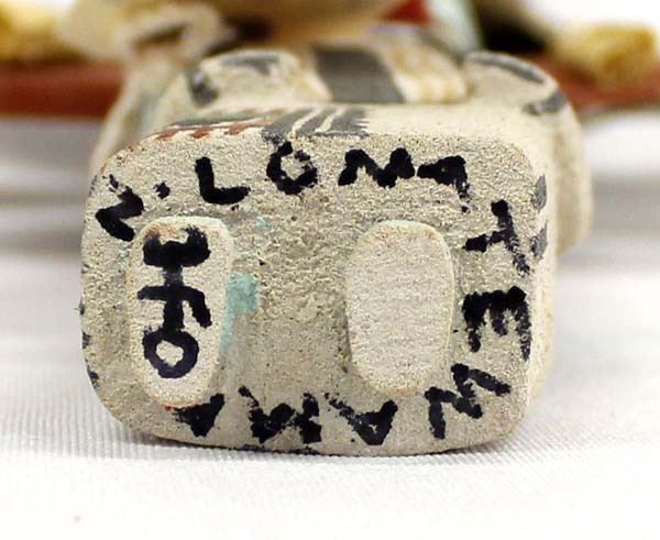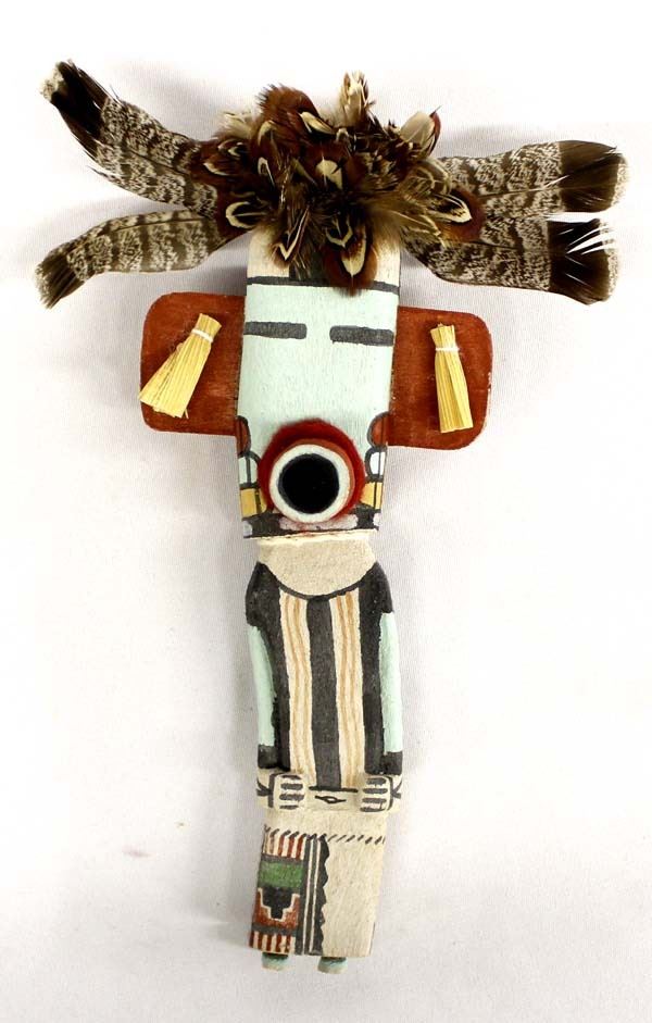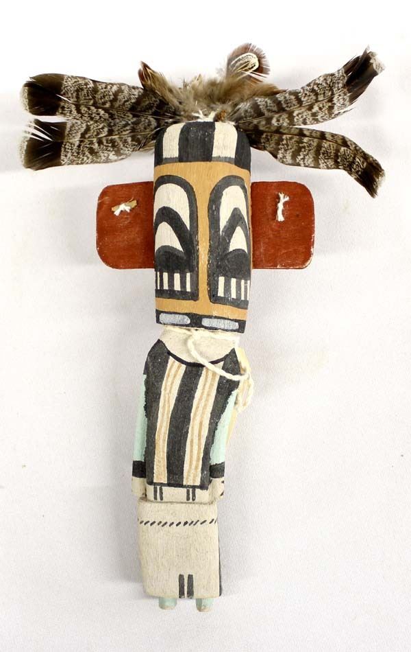 Native American Hopi Harvester Kachina by N. Lomatewama, measures 4'' x 10'' and is signed, very unique double sided kachina, embellished with feathers and cornhusk