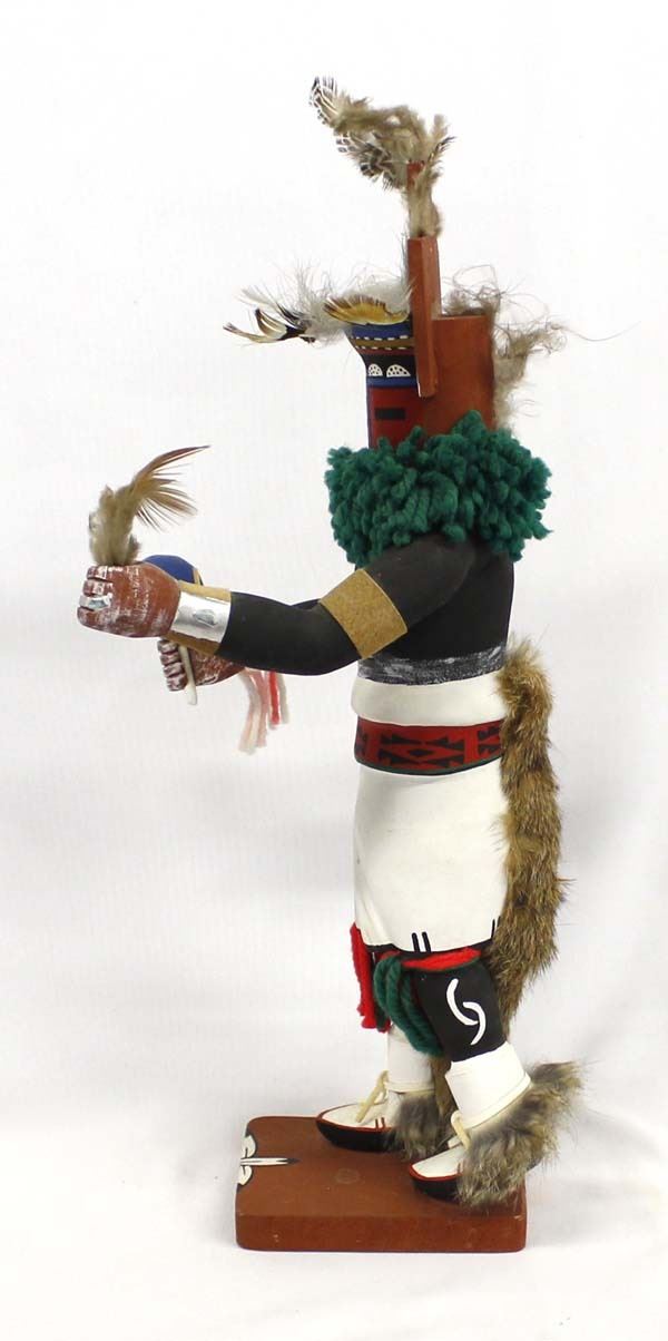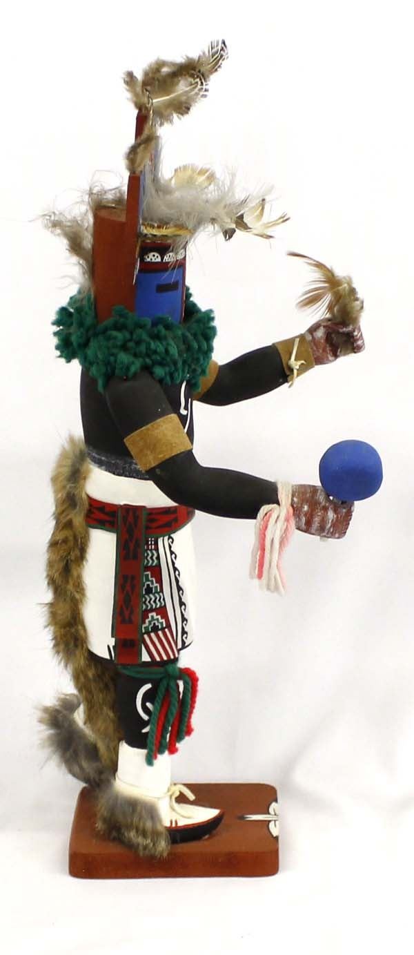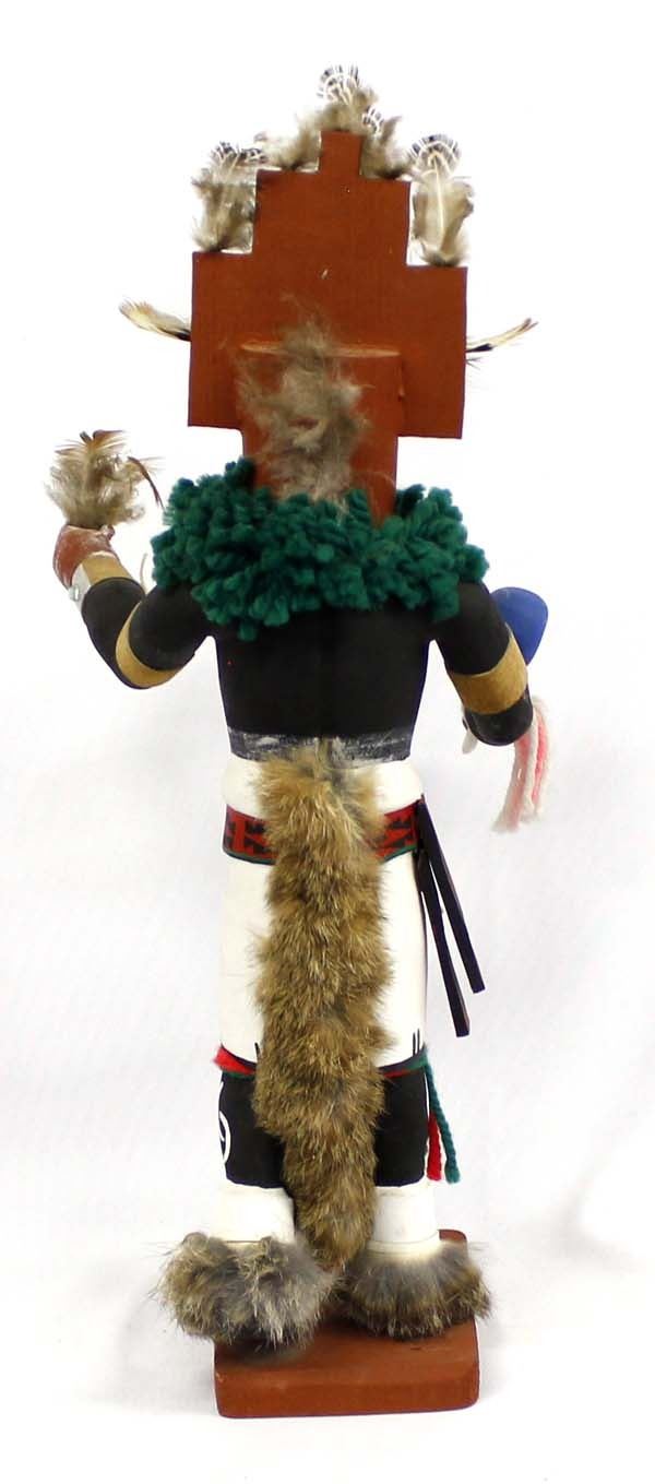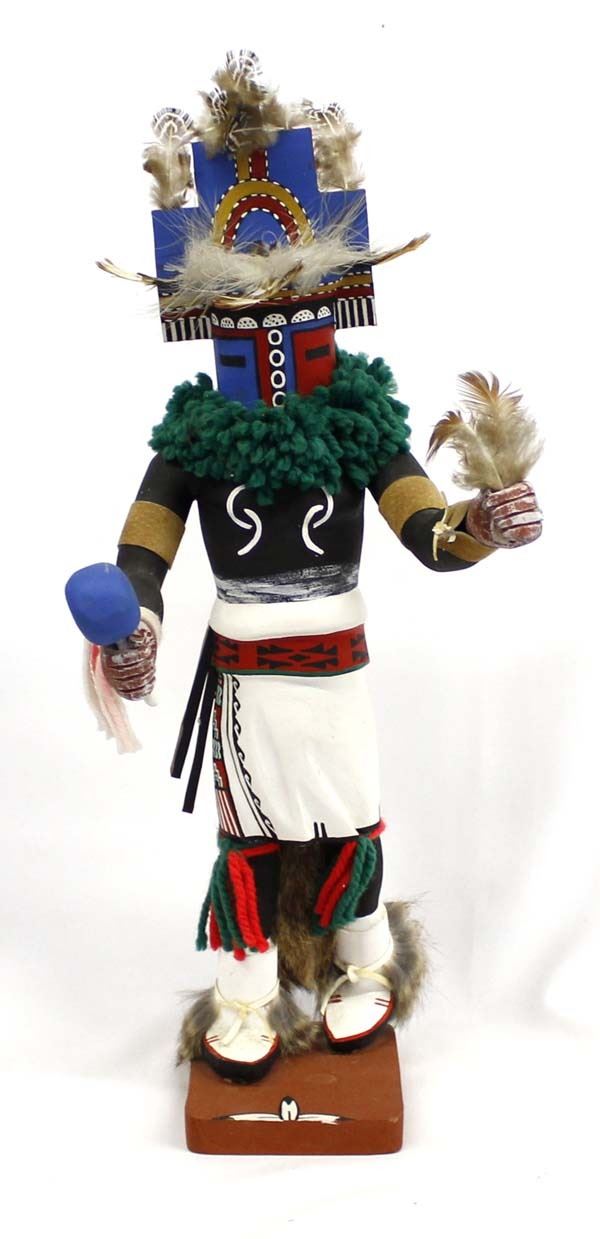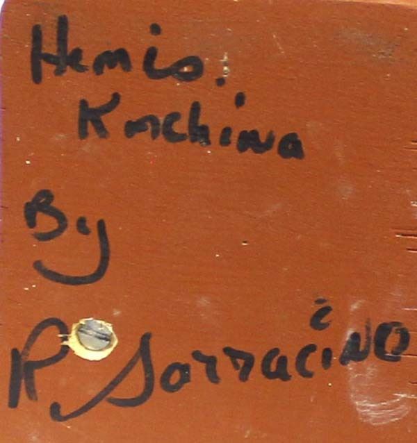 Native American Hopi Hemis Kachina by R. Sarracino, measures 19'' x 8'' x 8'' and is signed on the bottom, embellished with feathers, leather, yarn, and rabbit fur