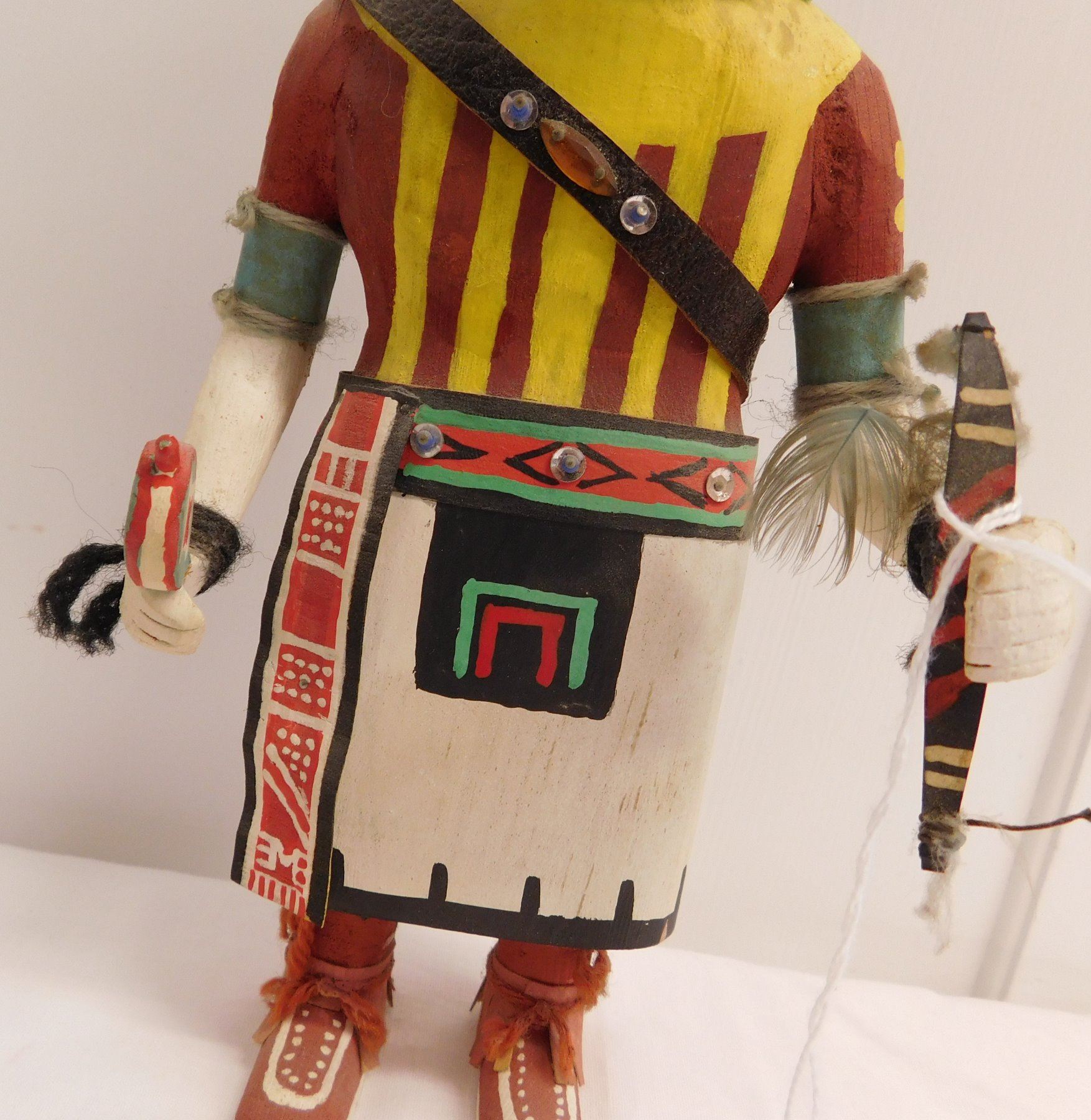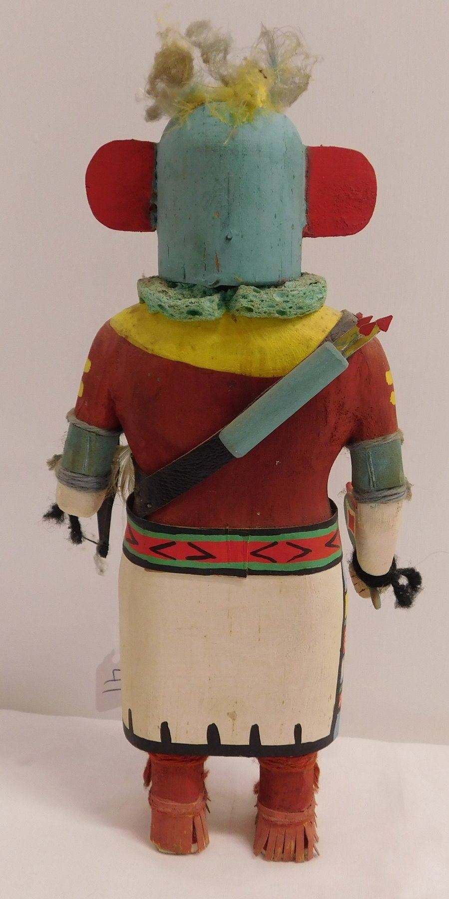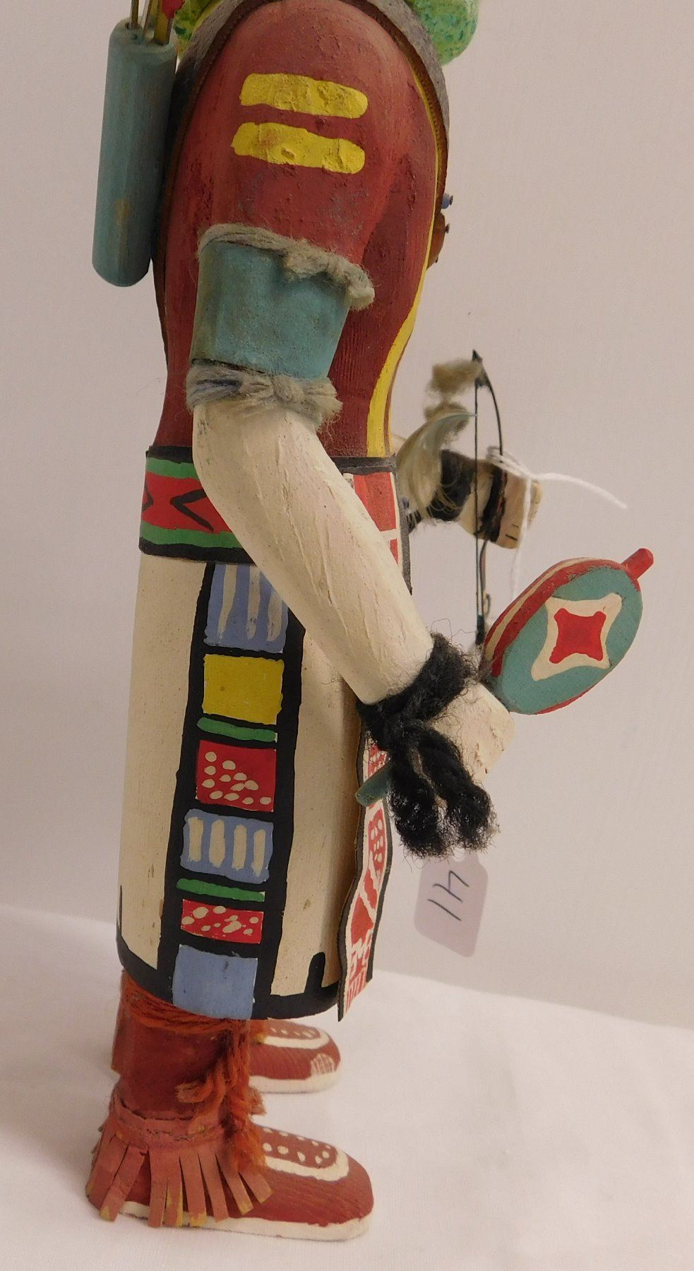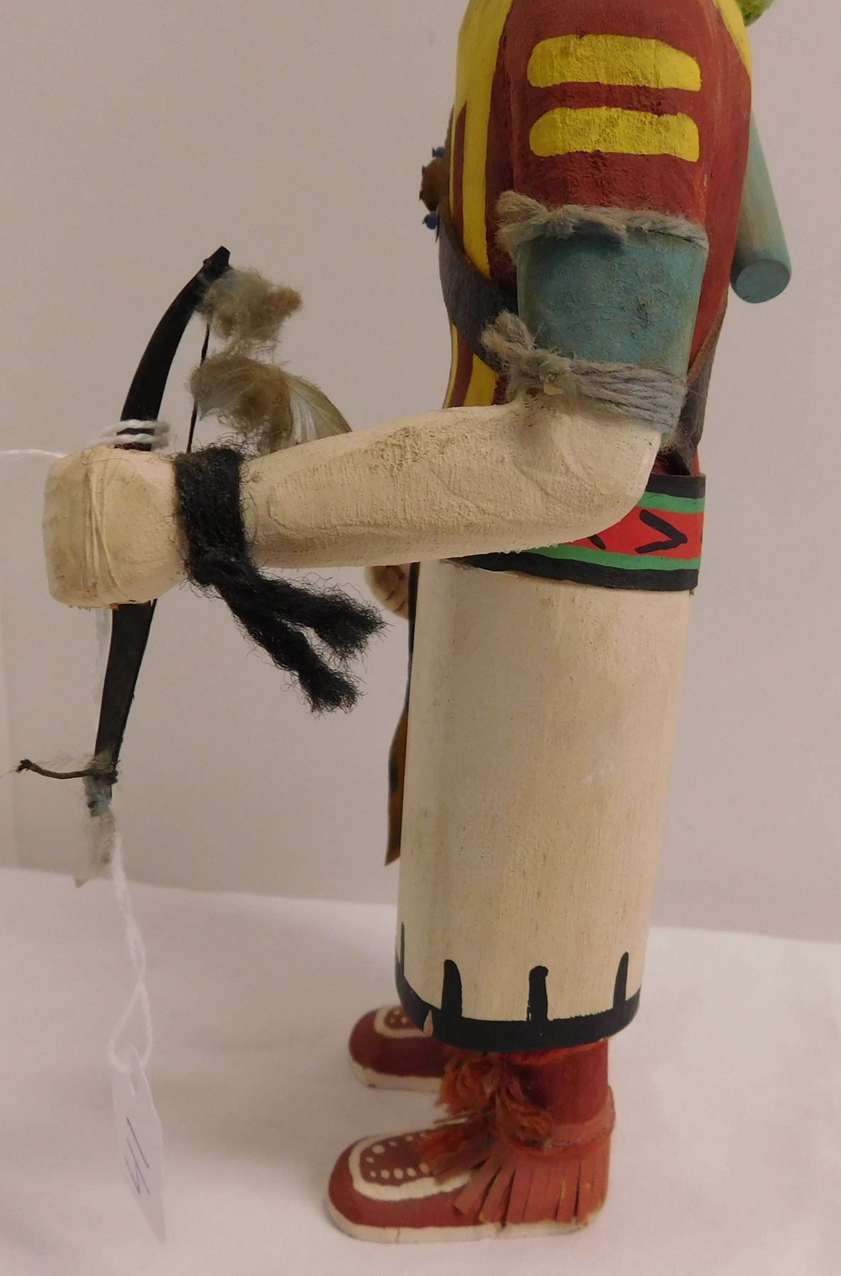Hopi Hochani Kachina, circa 1940s. Made of cottonwood, paint, feathers, leather and yarn, the item measures 5" x 3.25" x 11" tall. Hopi, Northern-Central Arizona. This kachina has a leather concho belt with quiver and arrows, holding a bow in left hand and a dance rattle in the other. Condition: Good, minor paint and feather loss, has dust, see images. Shipping: $25.50 w/insurance and signature, fragile item.