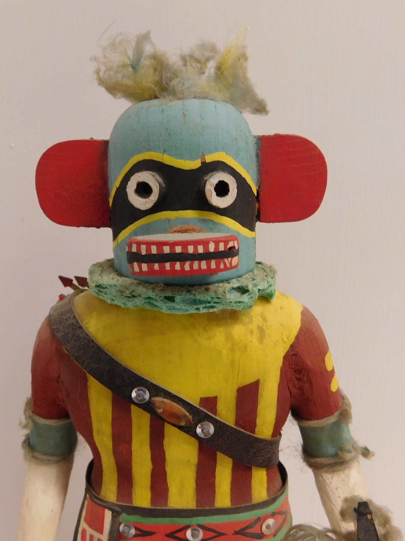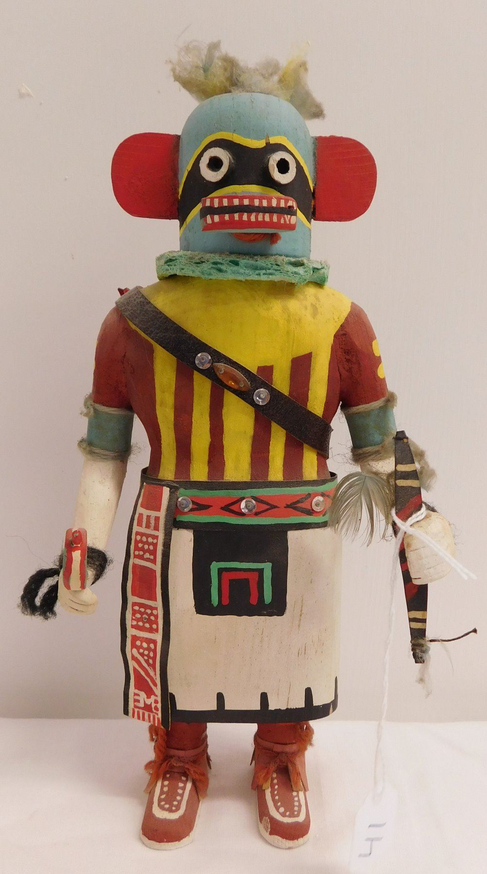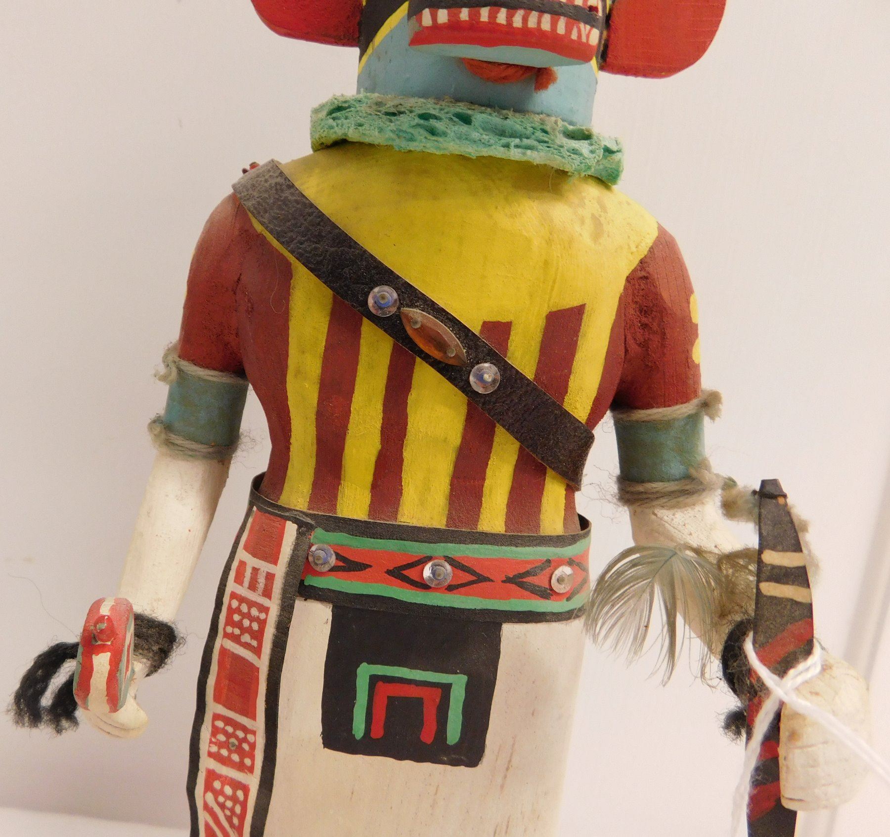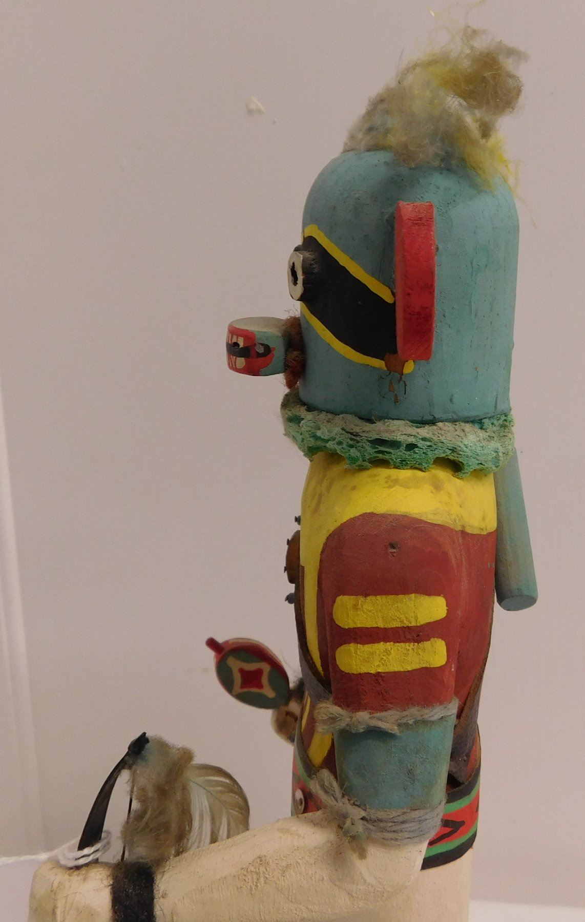 Hopi Hochani Kachina, circa 1940s. Made of cottonwood, paint, feathers, leather and yarn, the item measures 5" x 3.25" x 11" tall. Hopi, Northern-Central Arizona. This kachina has a leather concho belt with quiver and arrows, holding a bow in left hand and a dance rattle in the other. Condition: Good, minor paint and feather loss, has dust, see images. Shipping: $25.50 w/insurance and signature, fragile item.