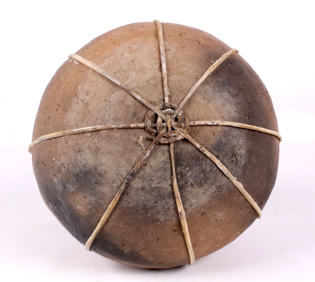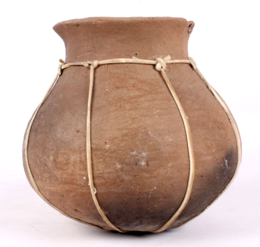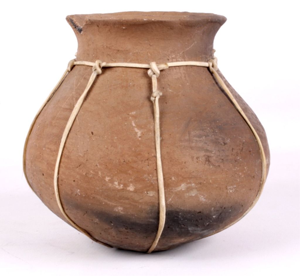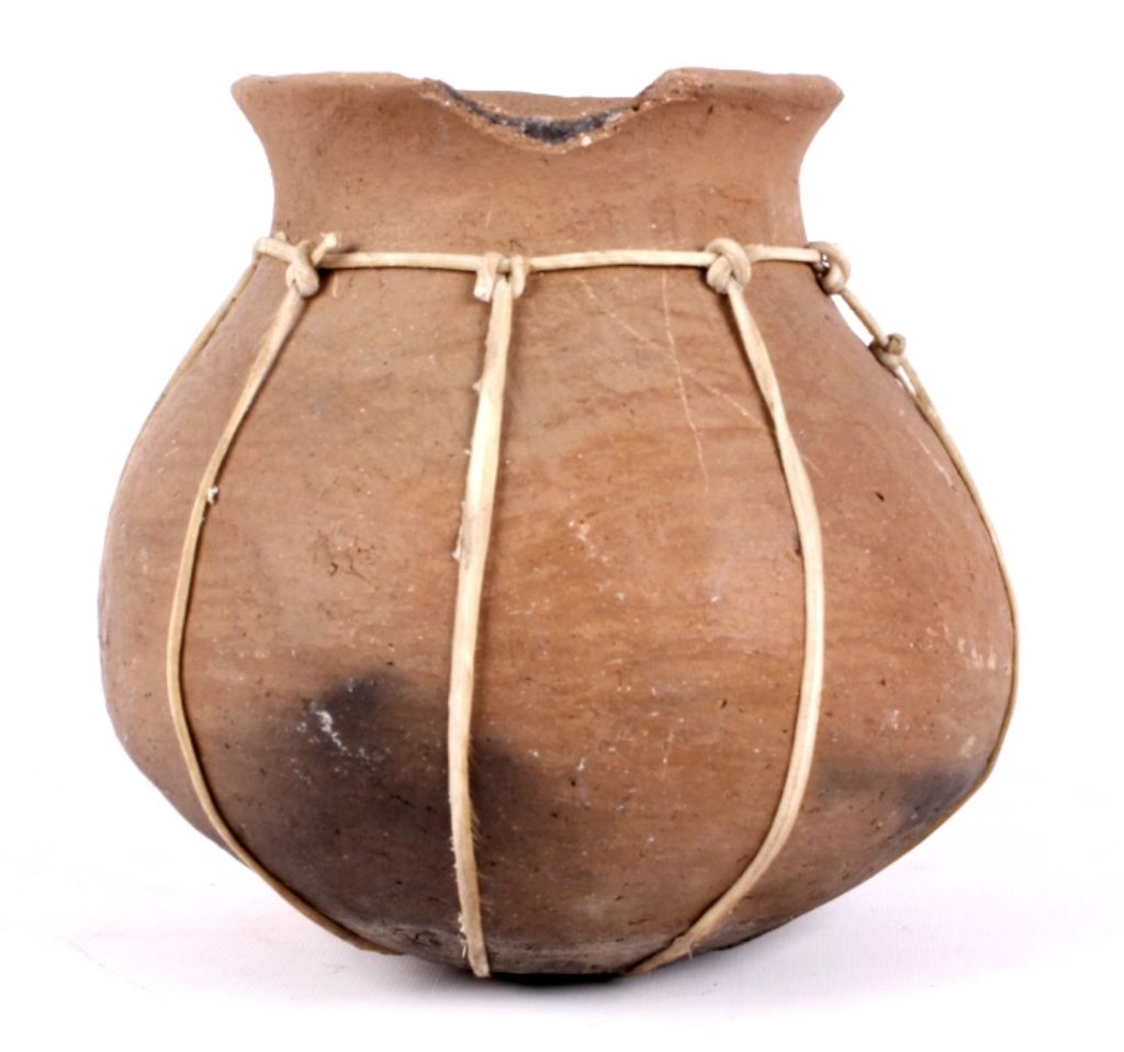 This lot features a Hopi Indian pot. It is handmade and is wrapped in animal sinew. There is a piece missing from the top lip. It measures 8.25" x 8.5".