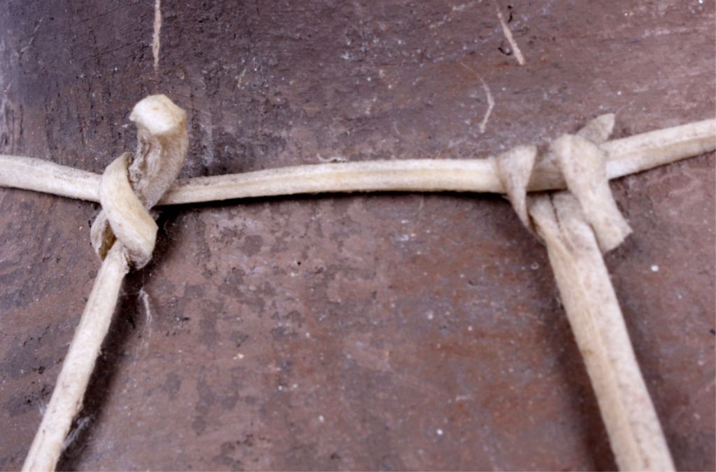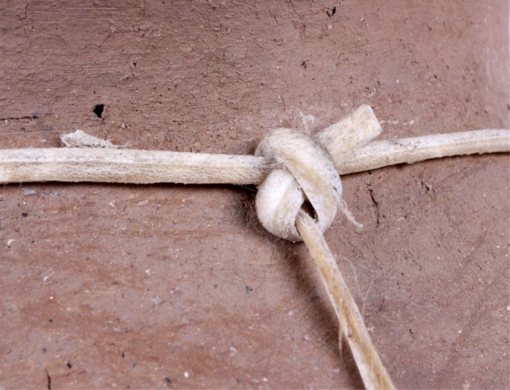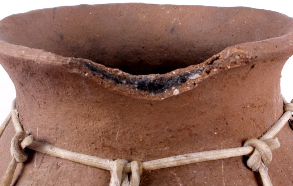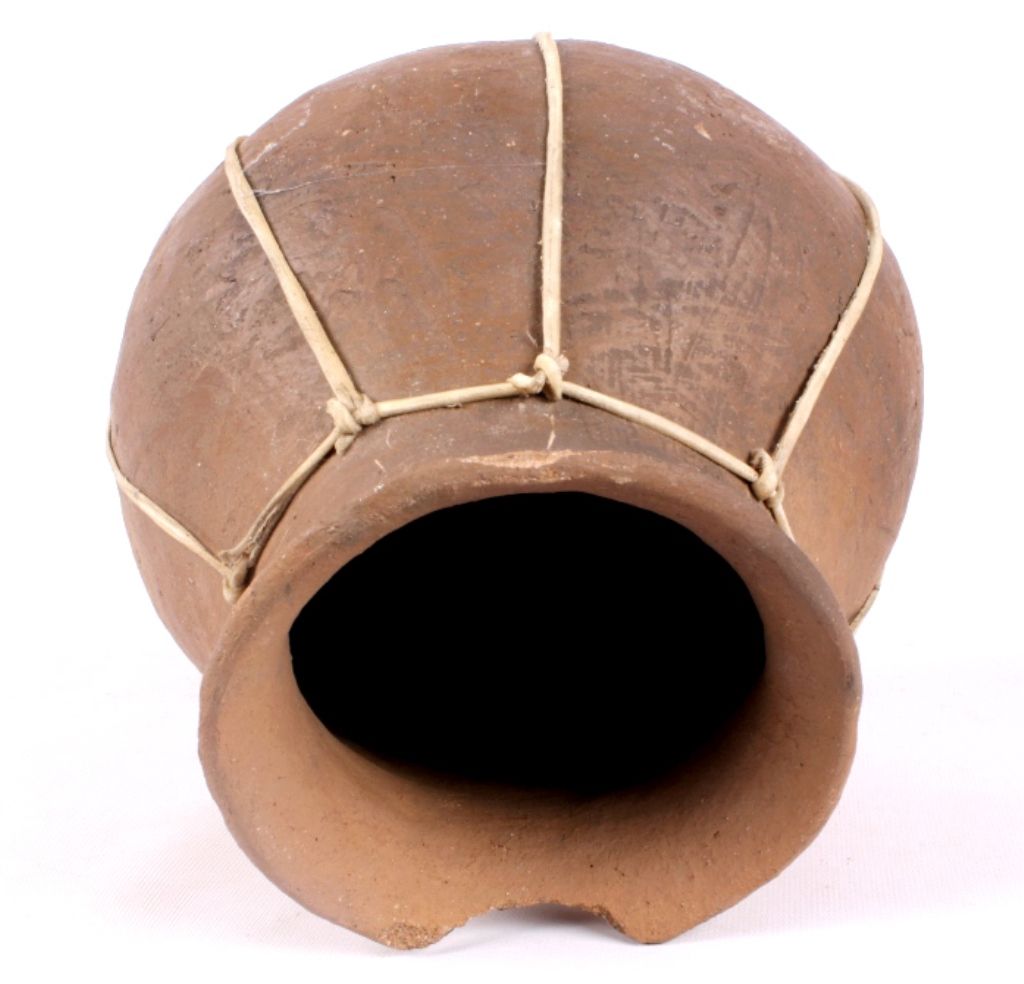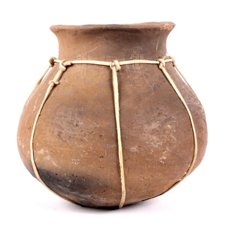 This lot features a Hopi Indian pot. It is handmade and is wrapped in animal sinew. There is a piece missing from the top lip. It measures 8.25" x 8.5".