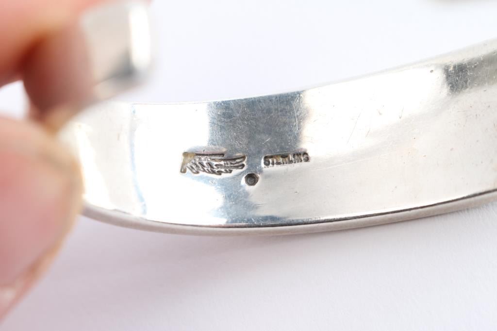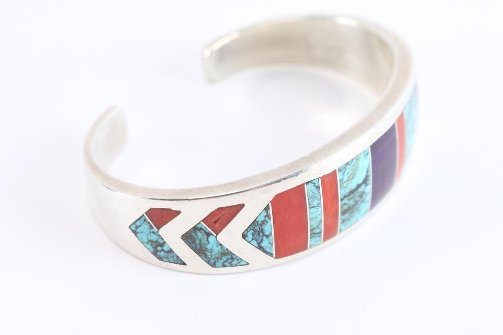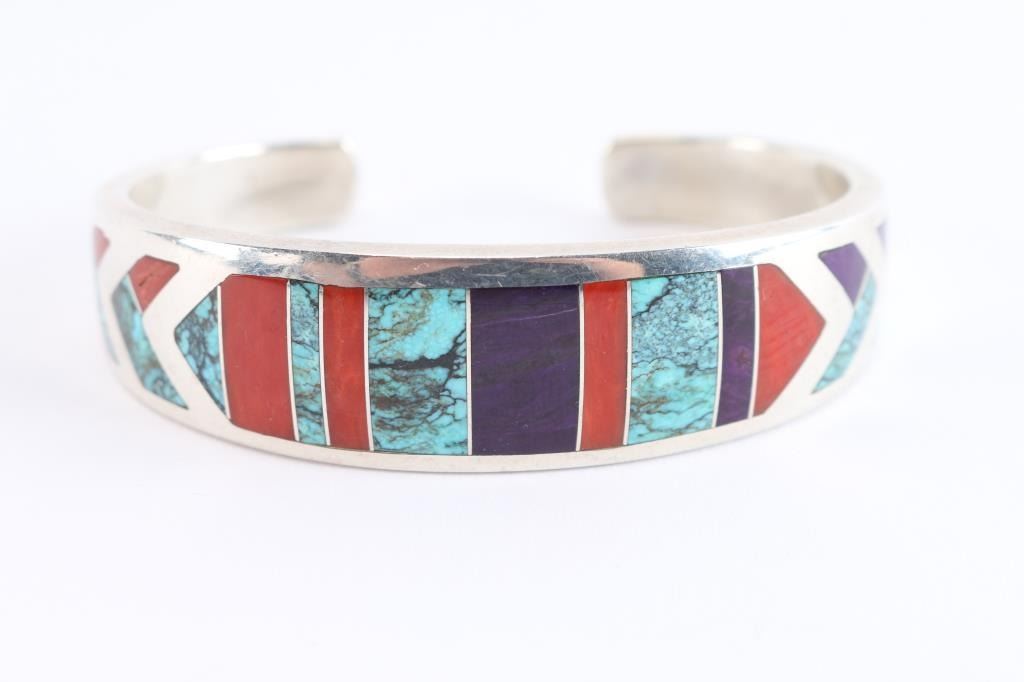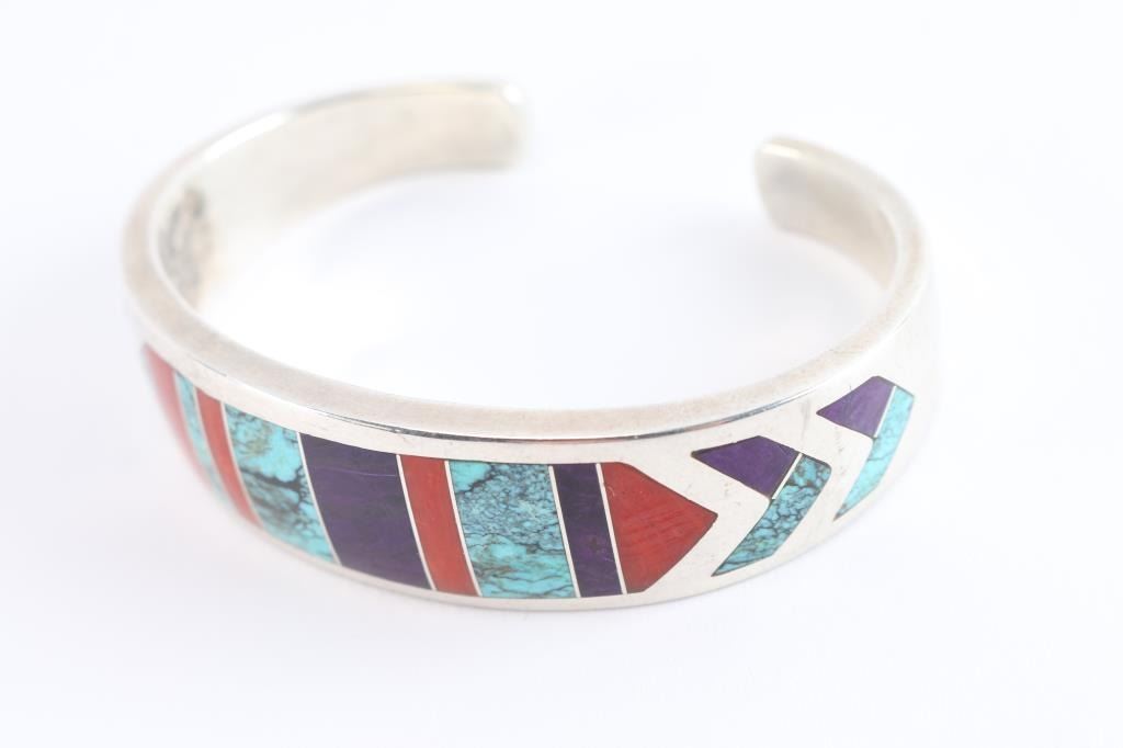 Turquoise, lapiz and coral modern inlaid design in sterling silver. Hallmarked. Measures 7 1/4" including gap.
