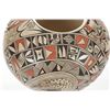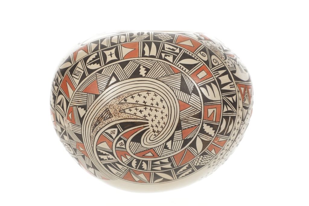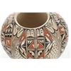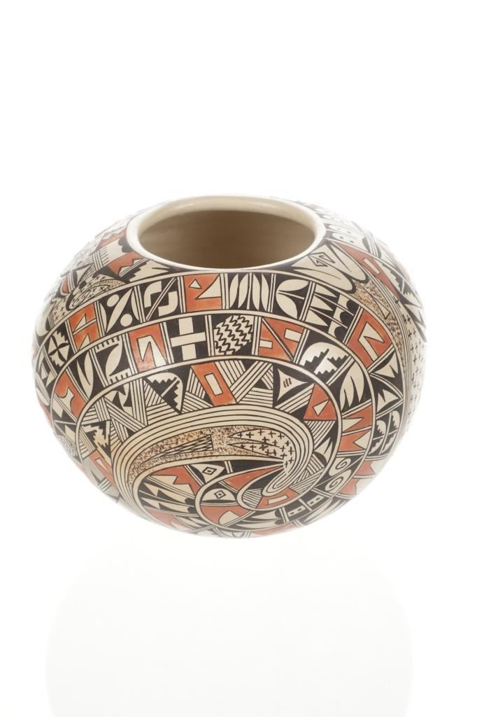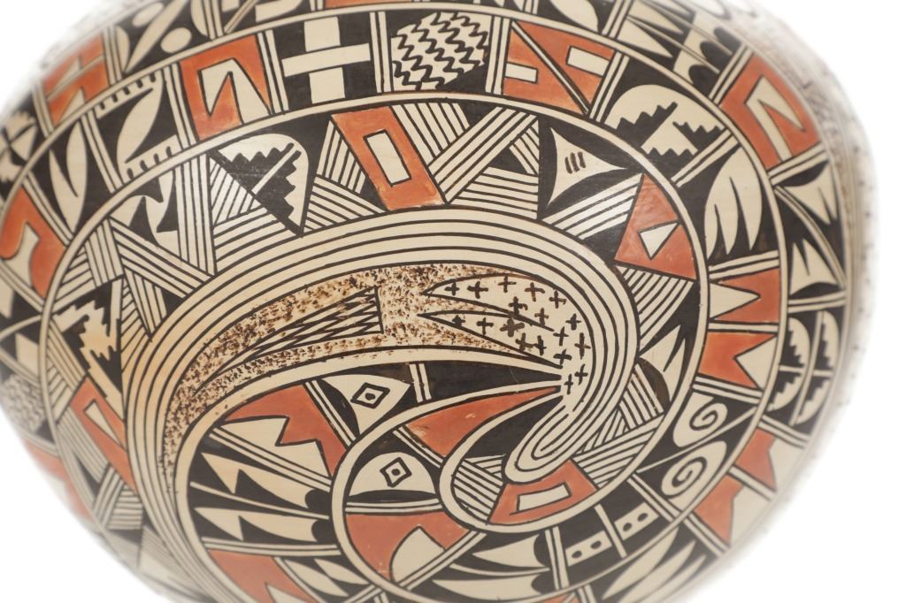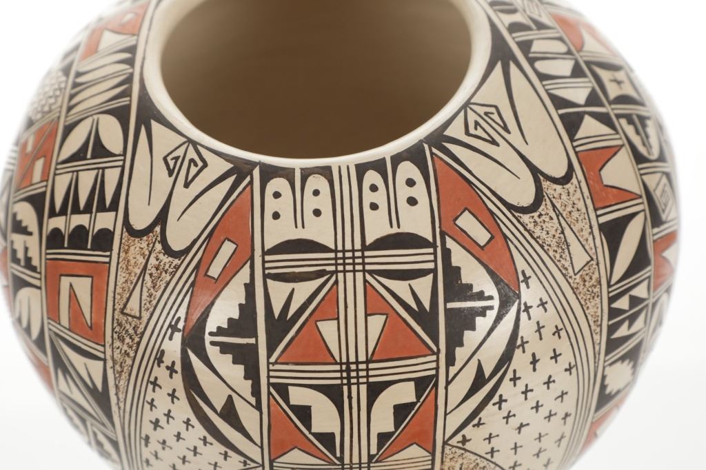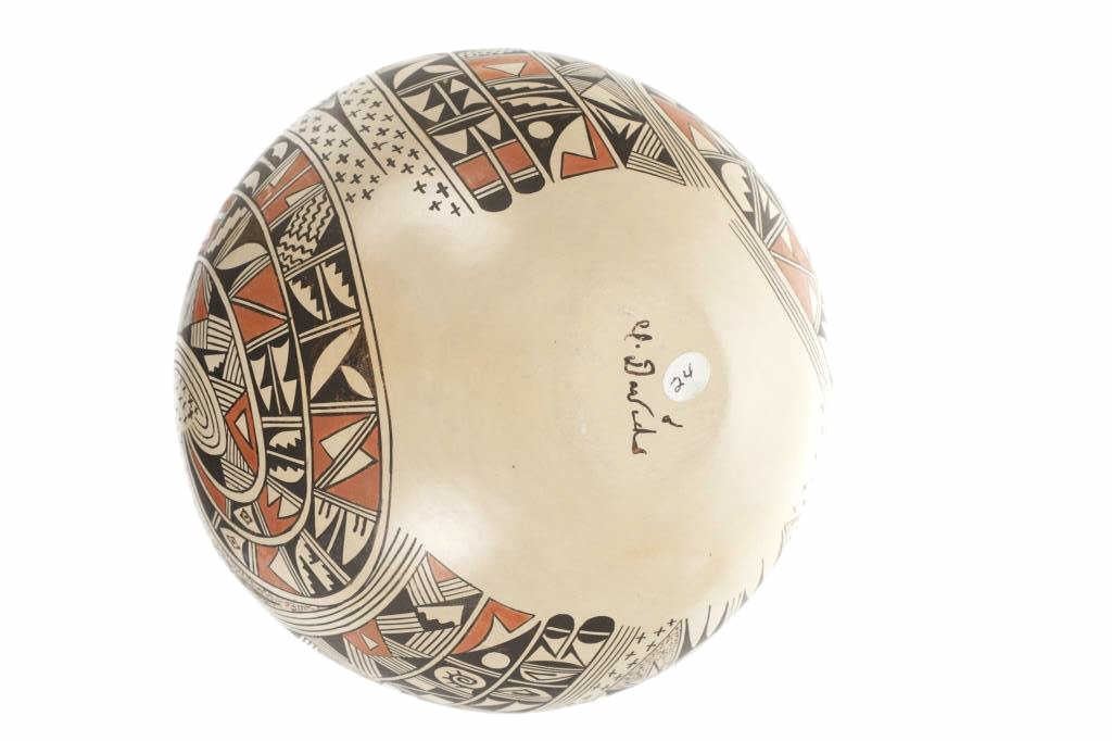 Offered in this lot is a signed polychrome pottery jar by Hopi Irma David. Irma David is the sister of well-known Hopi artist Neil David Sr. From Polacca, at First Mesa, Irma is a traditionalist in every sense. This Hopi Pottery Jar is handmade of natural clay indigenous to the area and decorated using mineral stone paint. This wonderful jar's design is bold polychrome geometric motifs on a white burnished slip glaze. The jar is signed on the bottom. The jar measures 5 1/2" tall and 21" around, with a 2 3/4" opening. The pot is in very good condition, with one small spot of damage on the side, please see photos.