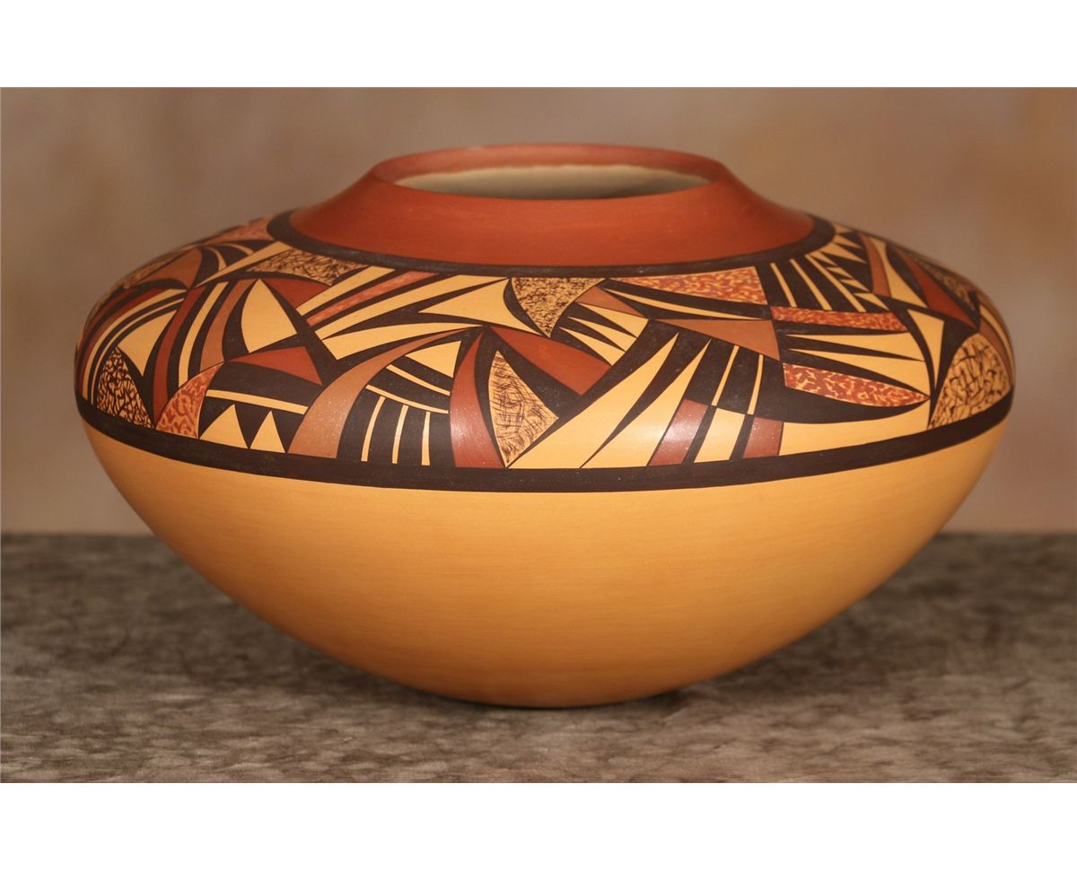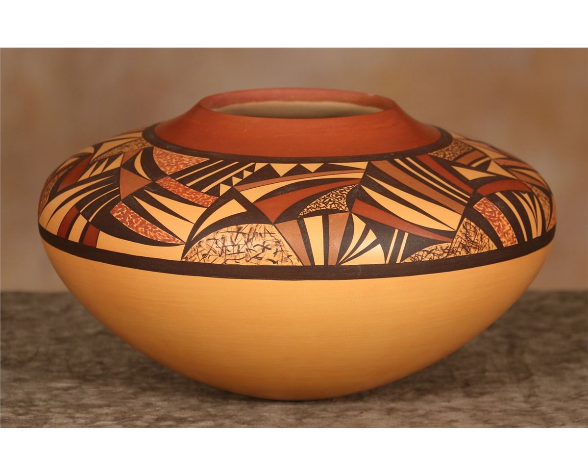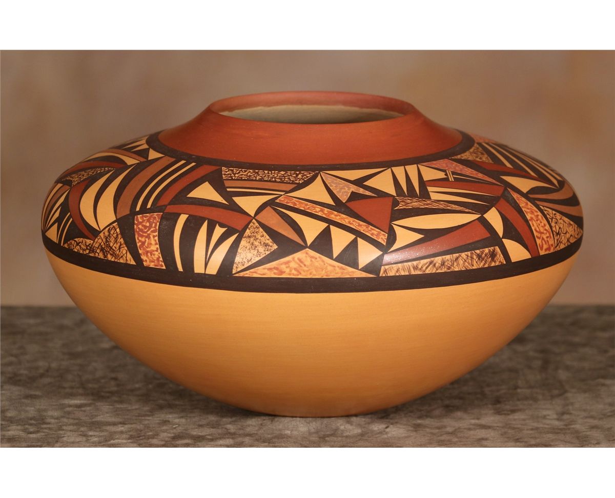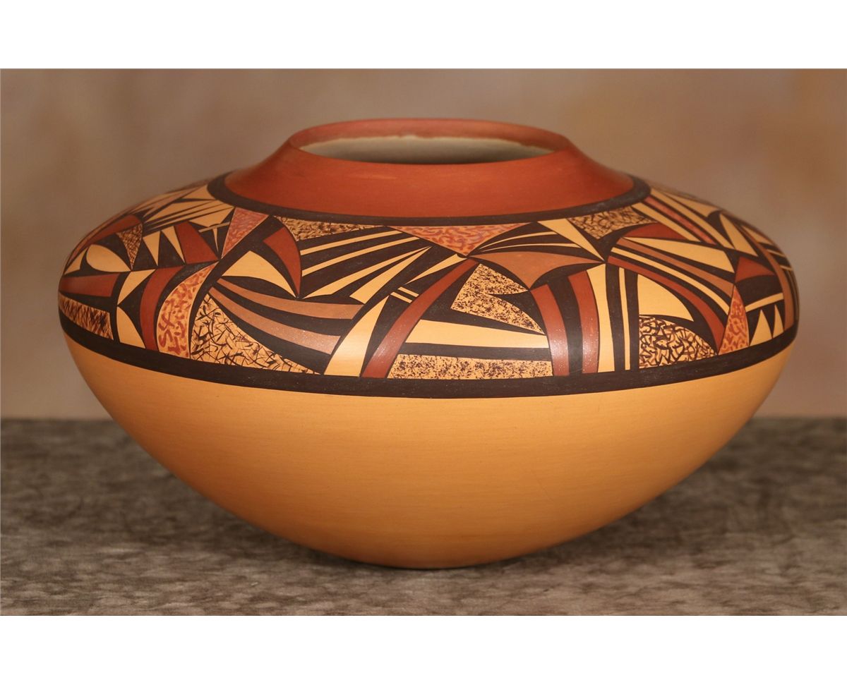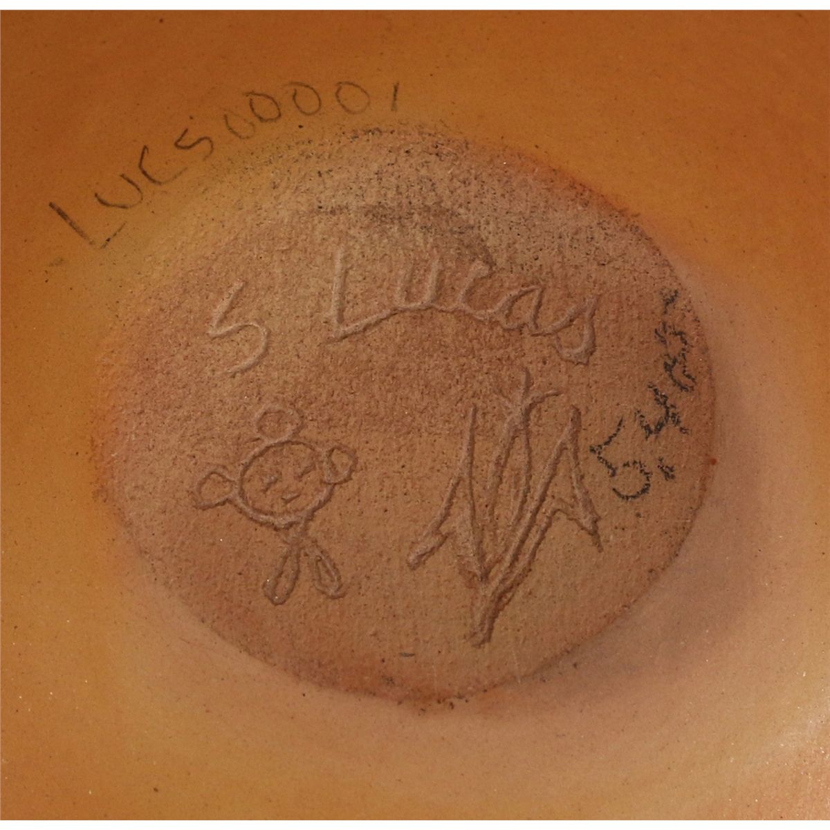 Hopi Jar by Steve Lucas (1955 - ). 6" x 10". Polychrome geometric designs on the upper third of the jar. This piece displays Lucas' distinctive red pigment with minute fragments of mica. Signed on base: S. Lucas [mud head and corn cypher]. Provenance: Indian River Gallery.