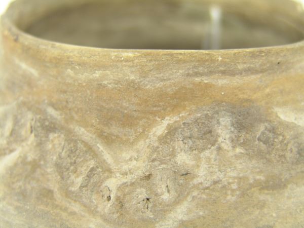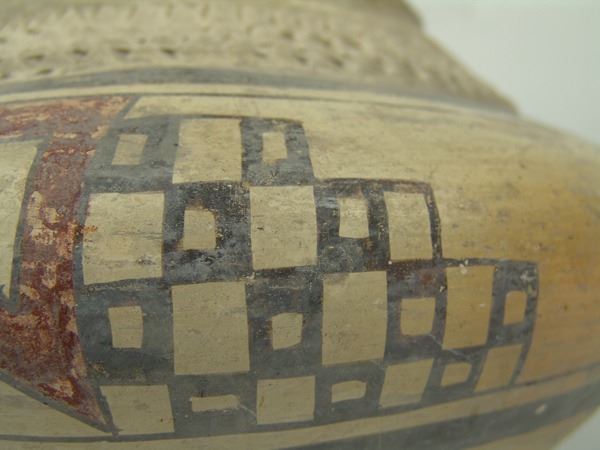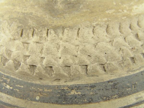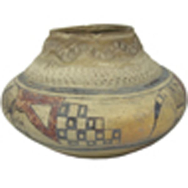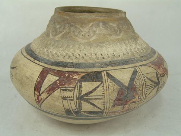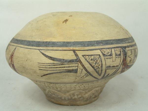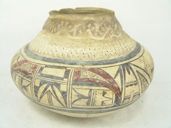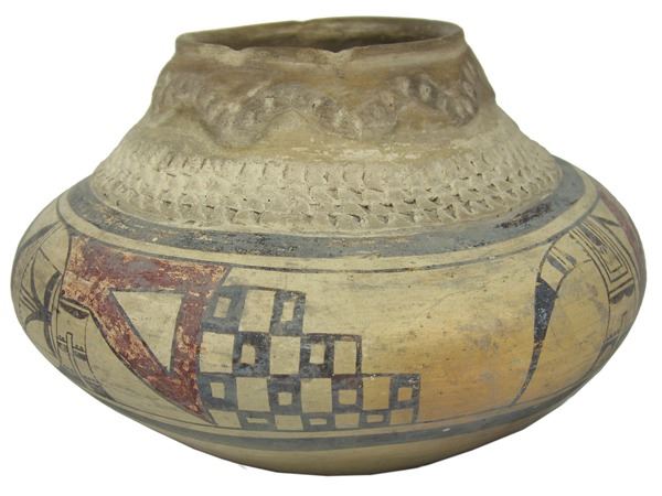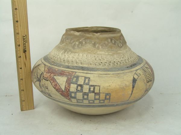 Rare early Sityatki revival jar with Avanyu figure around rim, impressions on shoulder, and rust and brown-on-cream, avian motif design band. Well used condition.7-1/2" x 11"
