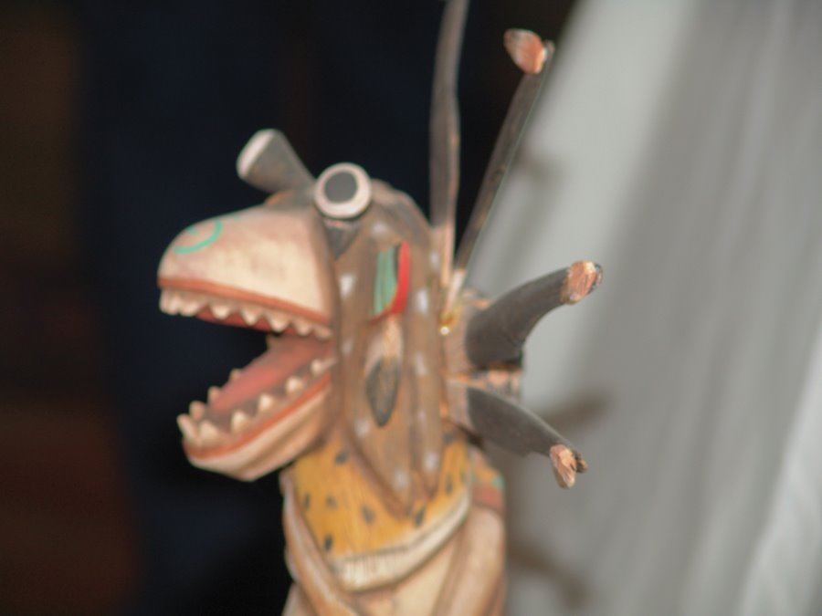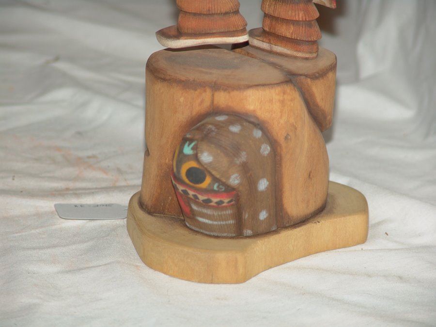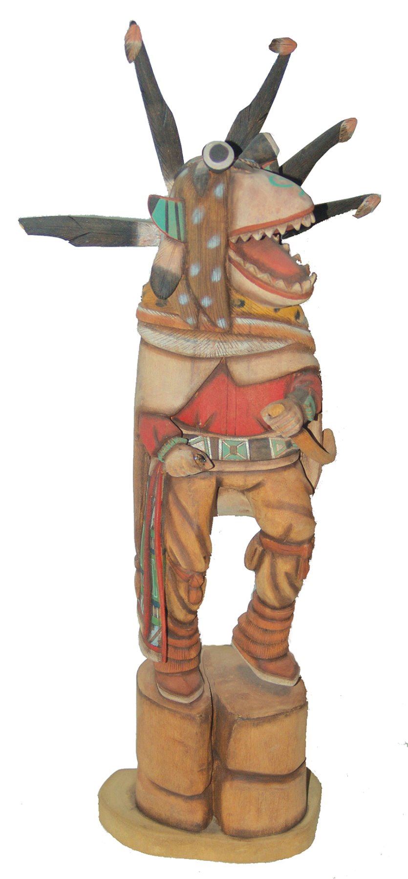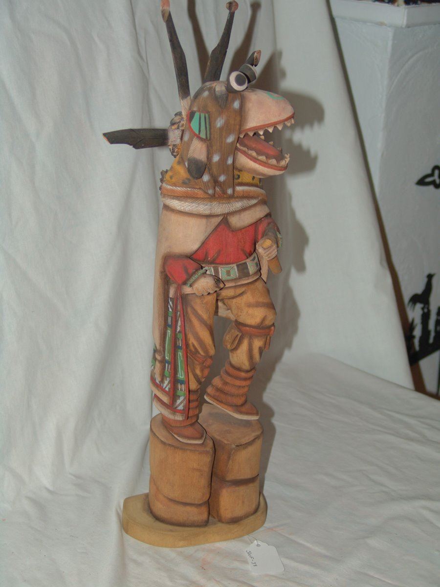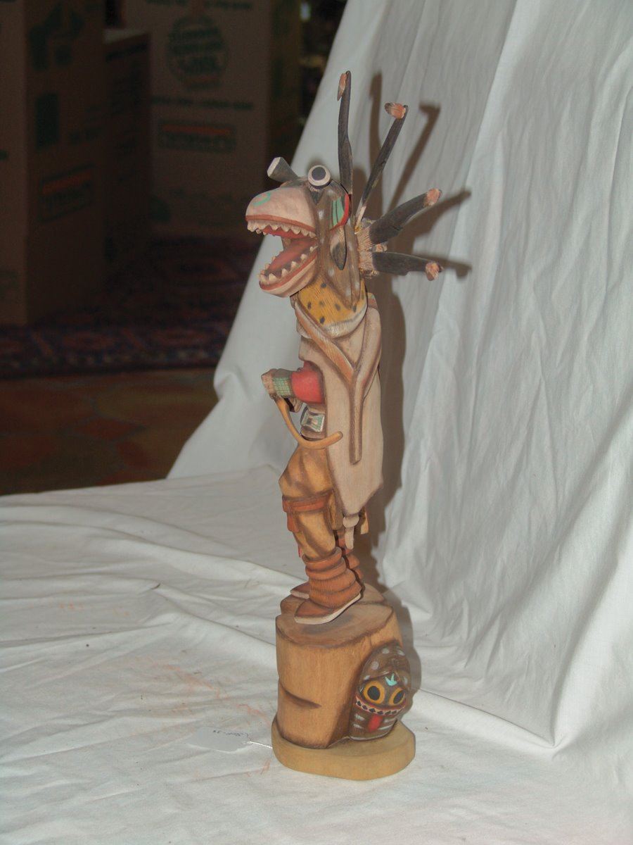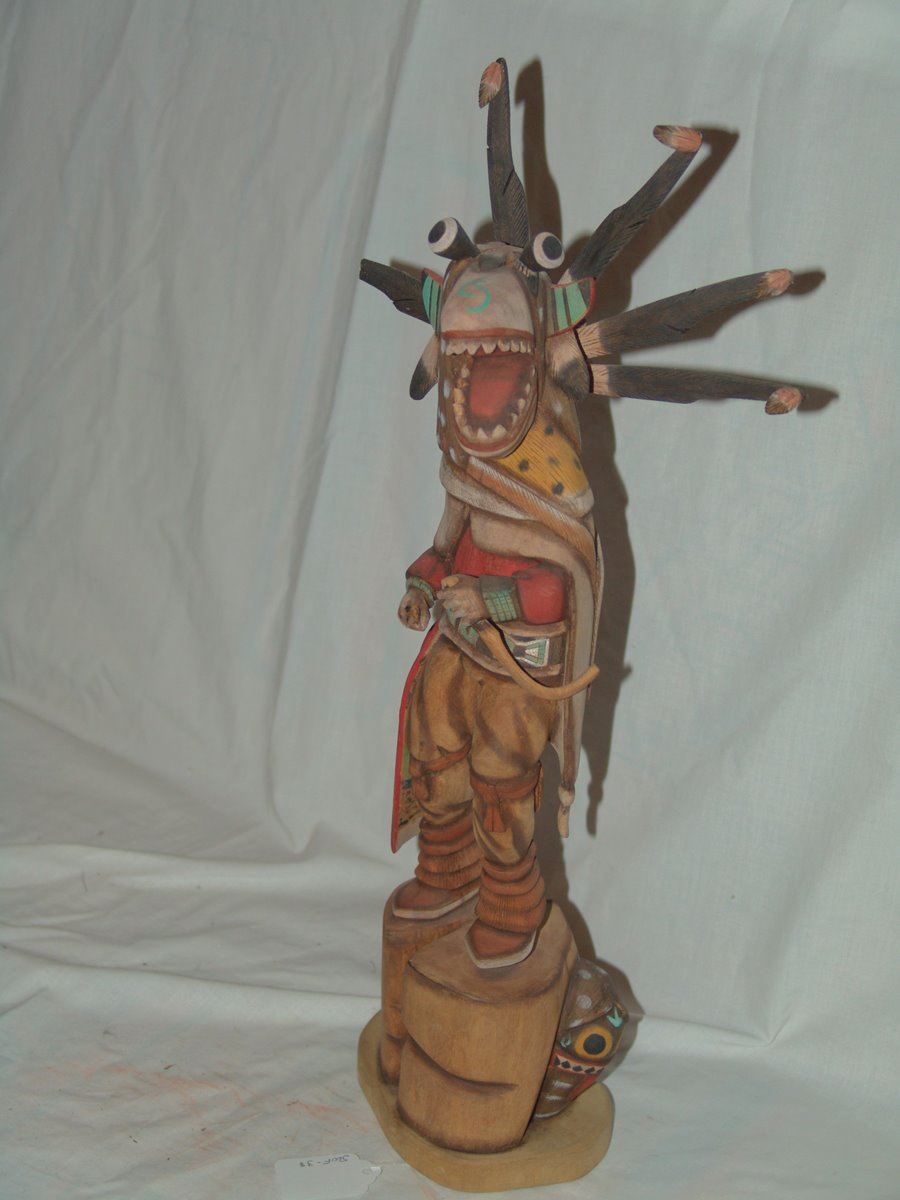 Very fine hand carved and painted cottonwood root Ogre kachina doll done in geat detail using traditional muted colors. Good condition, minor repairs, bow is broken off.,Ca. 2004,!8"