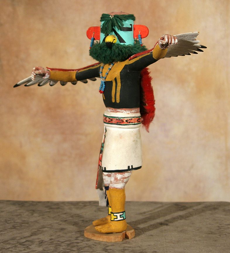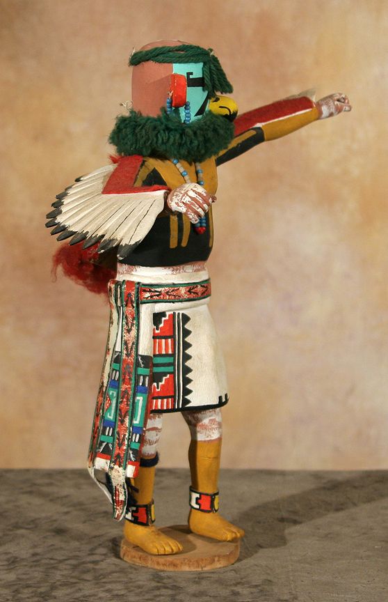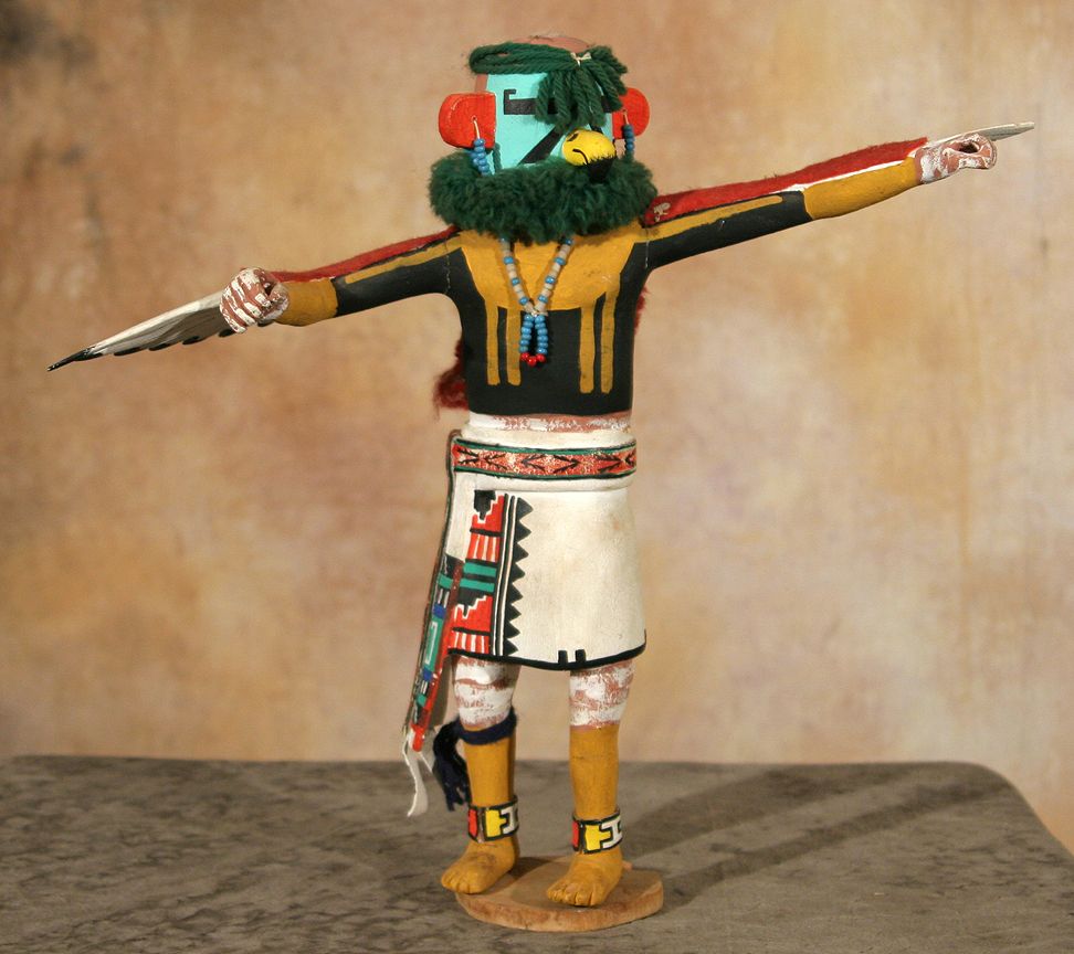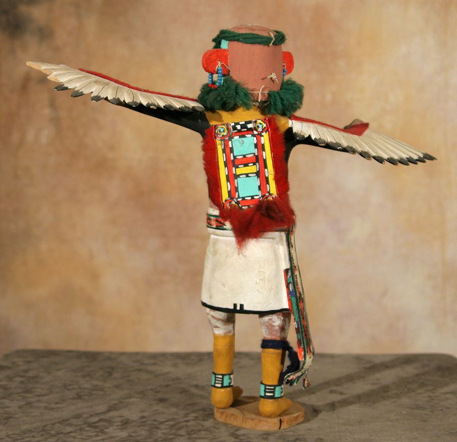Hopi Kachina Carving. 15" tall. Depicts a winged dancer. Nicely carved and highly detailed with bright colors & accent yarn. On a wooden base. Mid 1900s. (est. $600-900). CONDITION REPORTS: www.auctioninsantafe.com/docs/cr2012.pdf