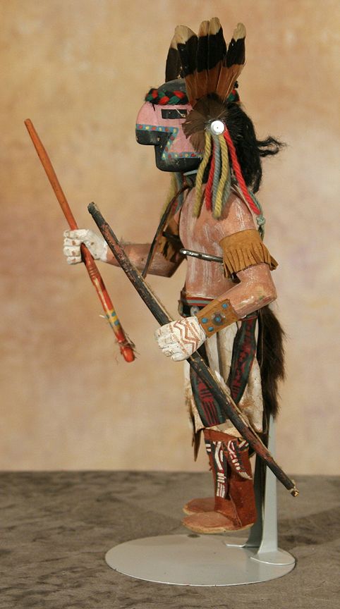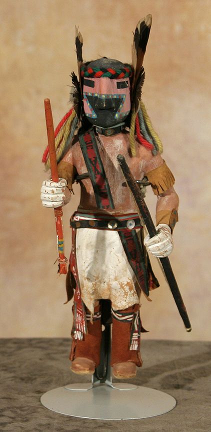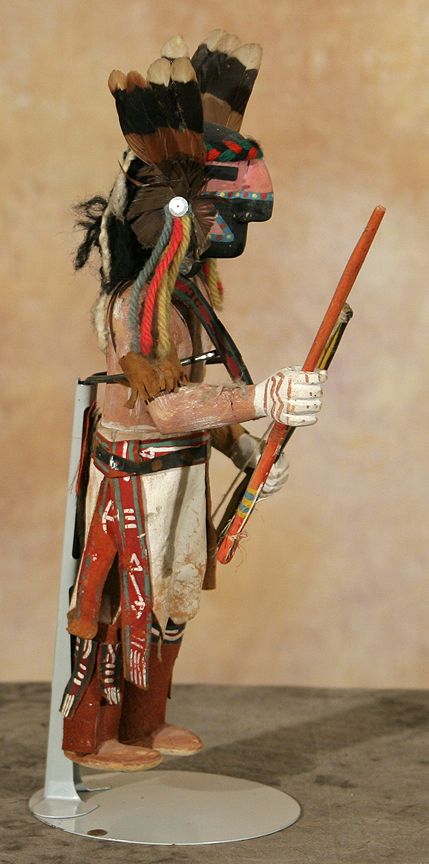 Hopi Kachina Carving. 11" tall on a metal stand. Nicely carved & highly detailed with bright colors & accent yarns, fur & feathers. On a metal stand. Mid 1900s. (est. $600-900). CONDITION REPORTS: www.auctioninsantafe.com/docs/cr2012.pdf