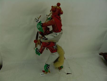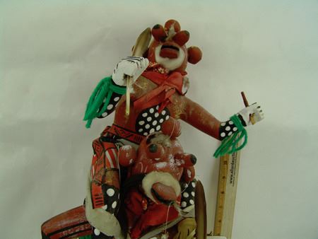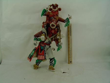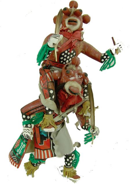 Ca. 1993, Rare hand carved and painted cottonwood root "Piggy-back Mudheads." (The kachina on the shoulders is paralyzed, and the kachina carrying him is blind, but can walk.) Good condition. 19-1/2" x 9-1/2" x 9"