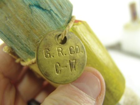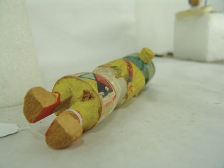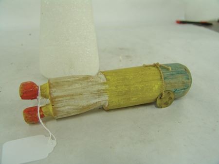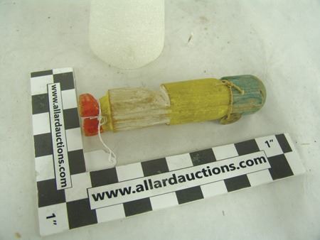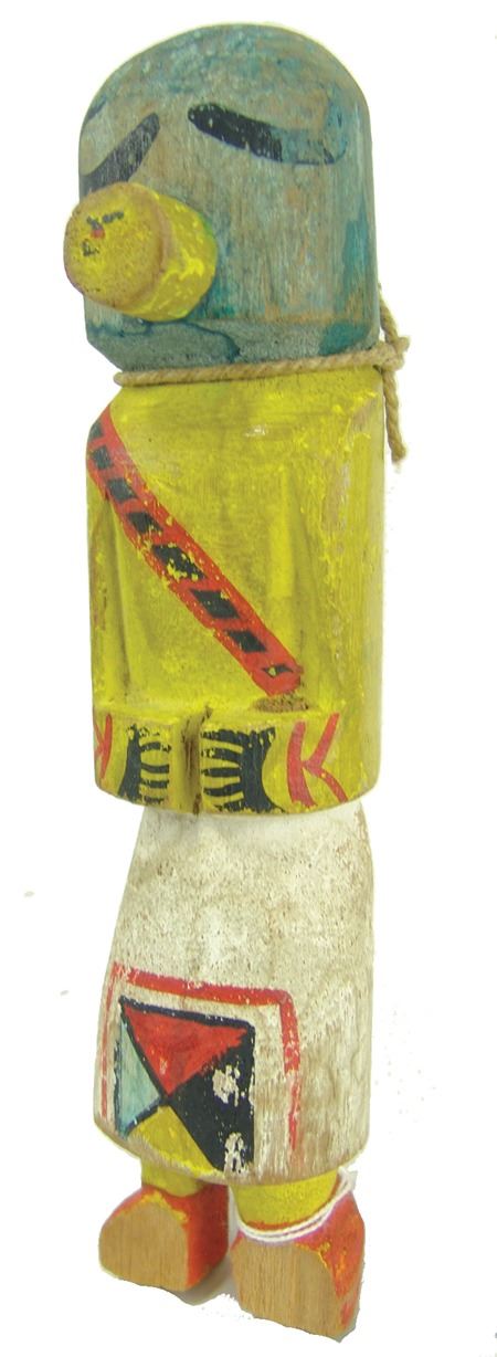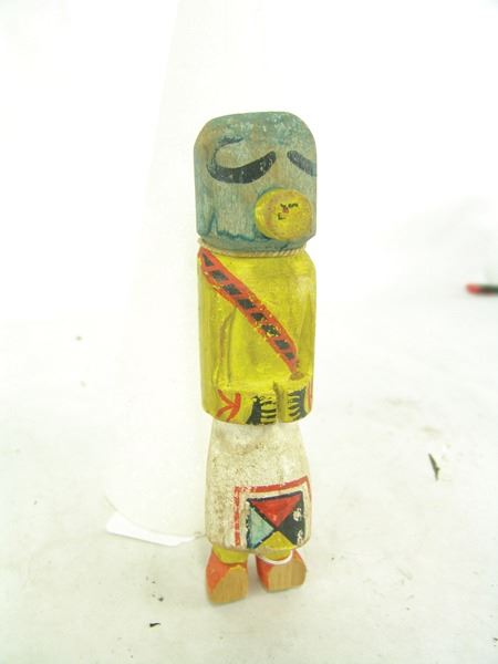Ca. 1950s, Wonderful hand carved and painted cottonwood root kachina doll, in original as-found condition and with brass collection tag around the neck. Missing the toes, good condition. 7-3/4"
