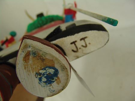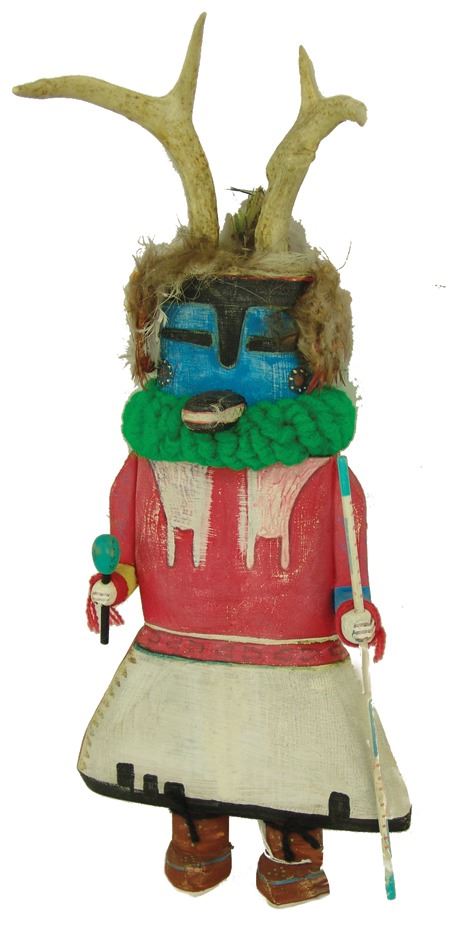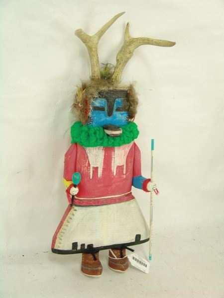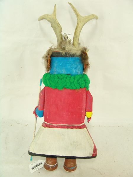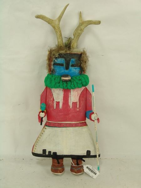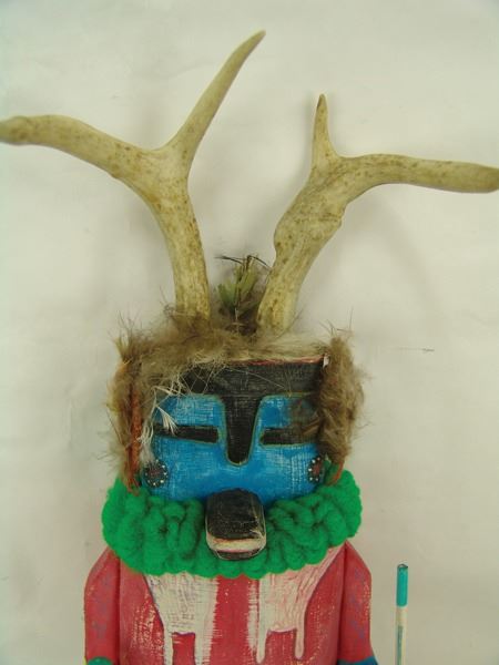 Ca. 1980s, Colorful hand carved and painted wooden deer dancer doll done in the flat style and with real antlers. Good condition, signed "JJ." Antlers 13"+