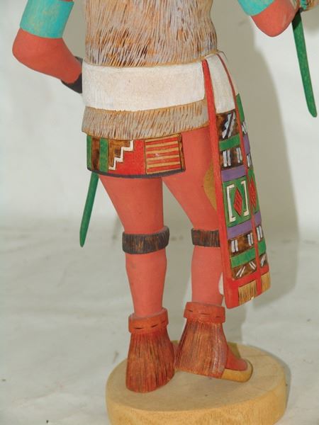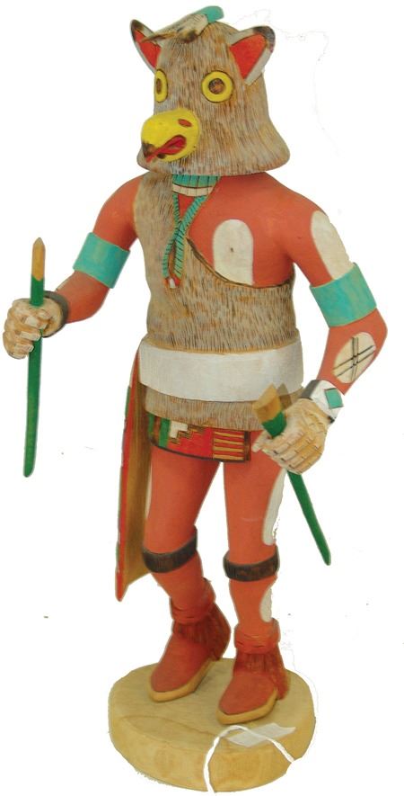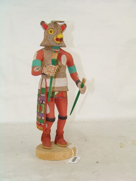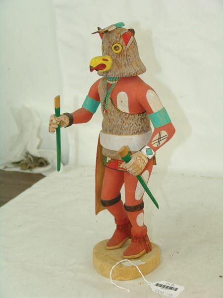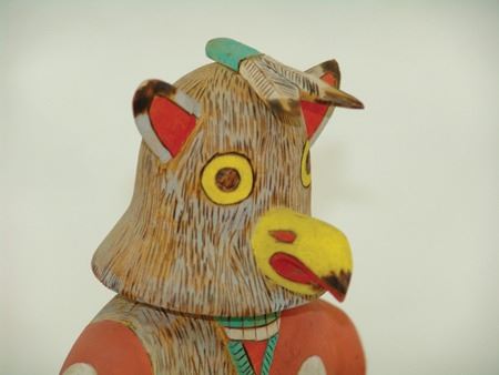 Late 1900s, Expertly hand carved and painted cotton wood root doll done in "one piece" style, this is a "Mongwu" (great horned owl.) Very good condition, an impressive example. 14-1/2"