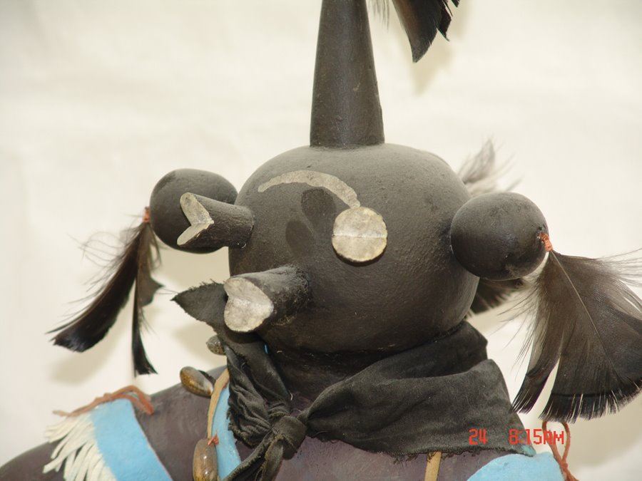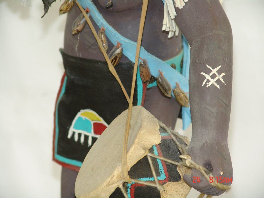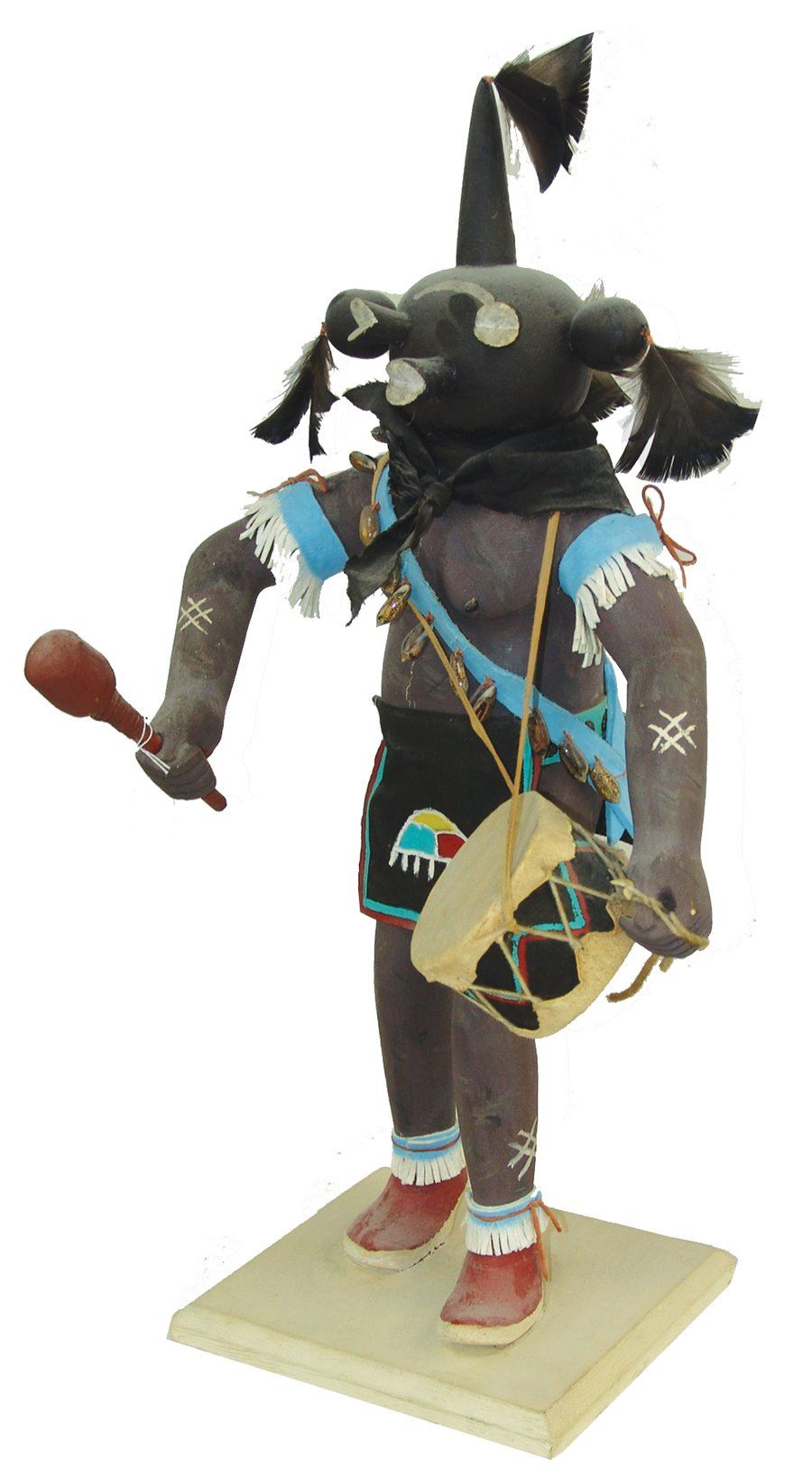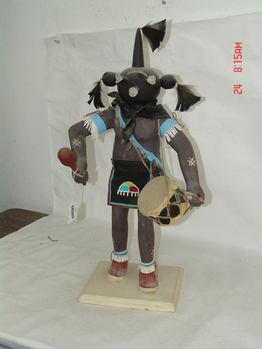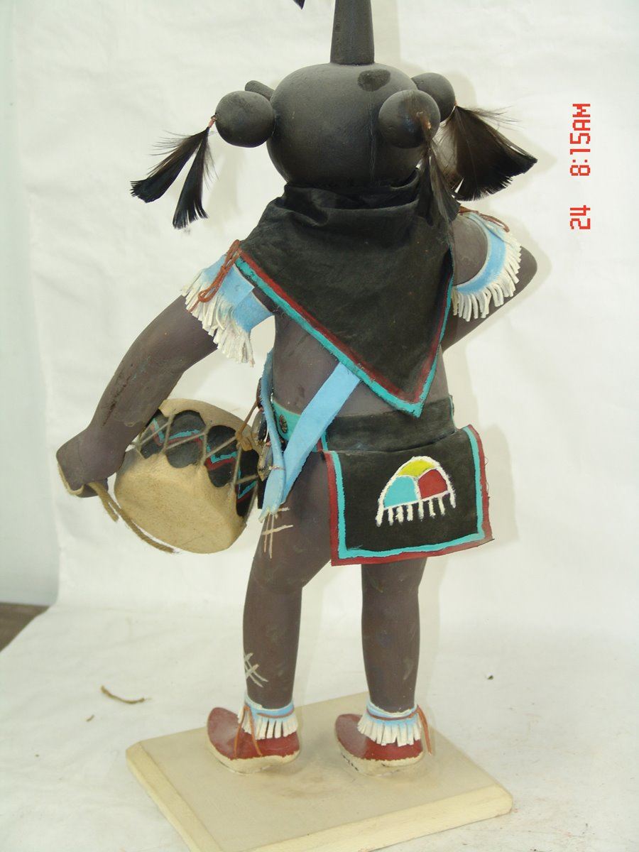 Large vintage hand carved and painted black Mudhead doll shown with drum and beater. Good condition, minor repairs.,Mid 1900s,24" tall