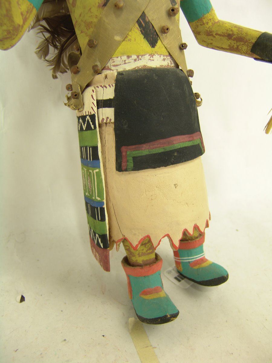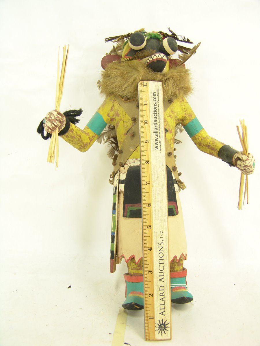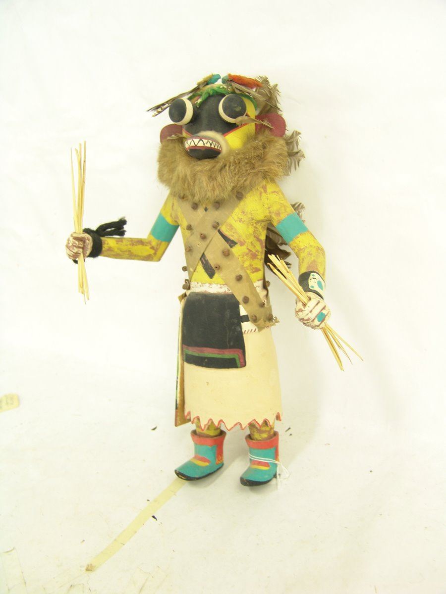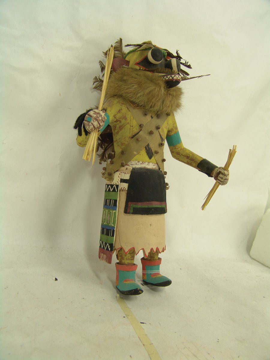 Early hand carved and painted cottonwood root Kachina doll with early style skirt and other details. This may be a "Hu" or "Whipper" kachina. Good condition some scuffs and cracks. A hard one to find.,Early/Mid 1900s,14"