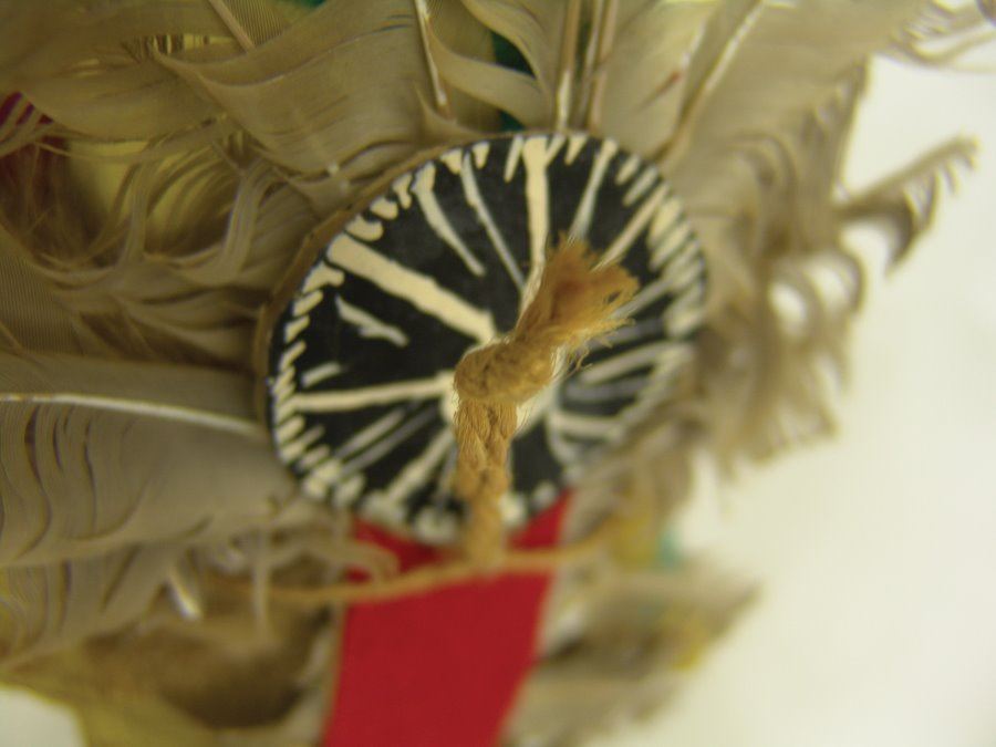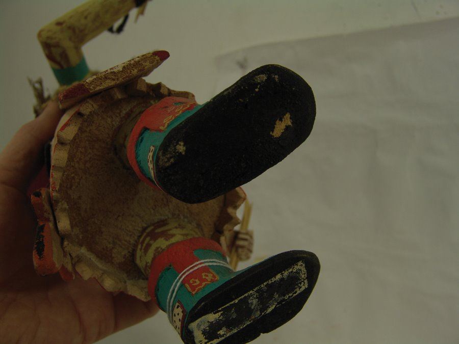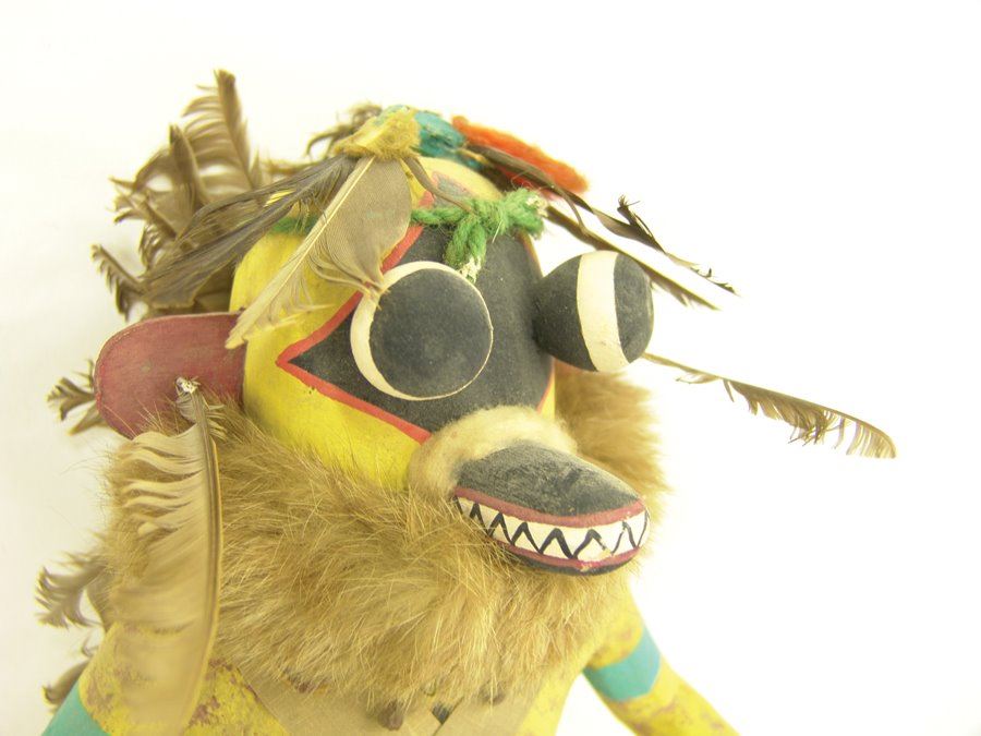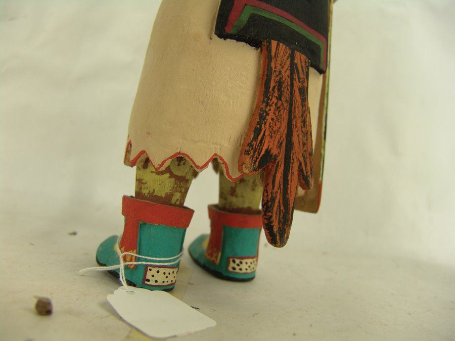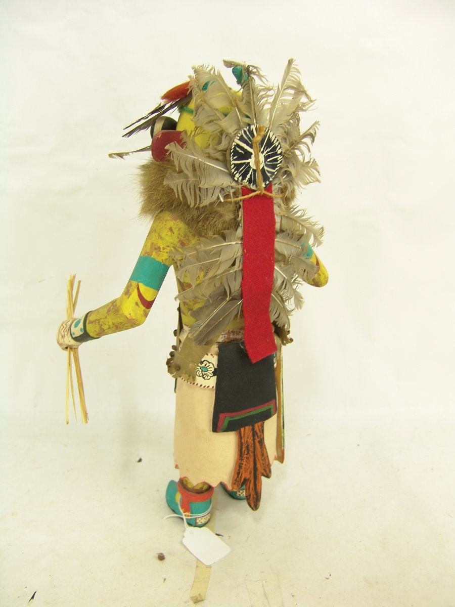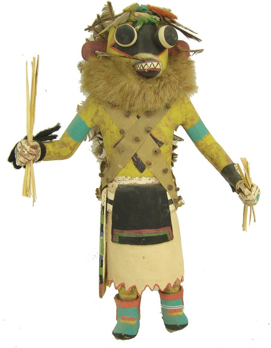 Early hand carved and painted cottonwood root Kachina doll with early style skirt and other details. This may be a "Hu" or "Whipper" kachina. Good condition some scuffs and cracks. A hard one to find.,Early/Mid 1900s,14"