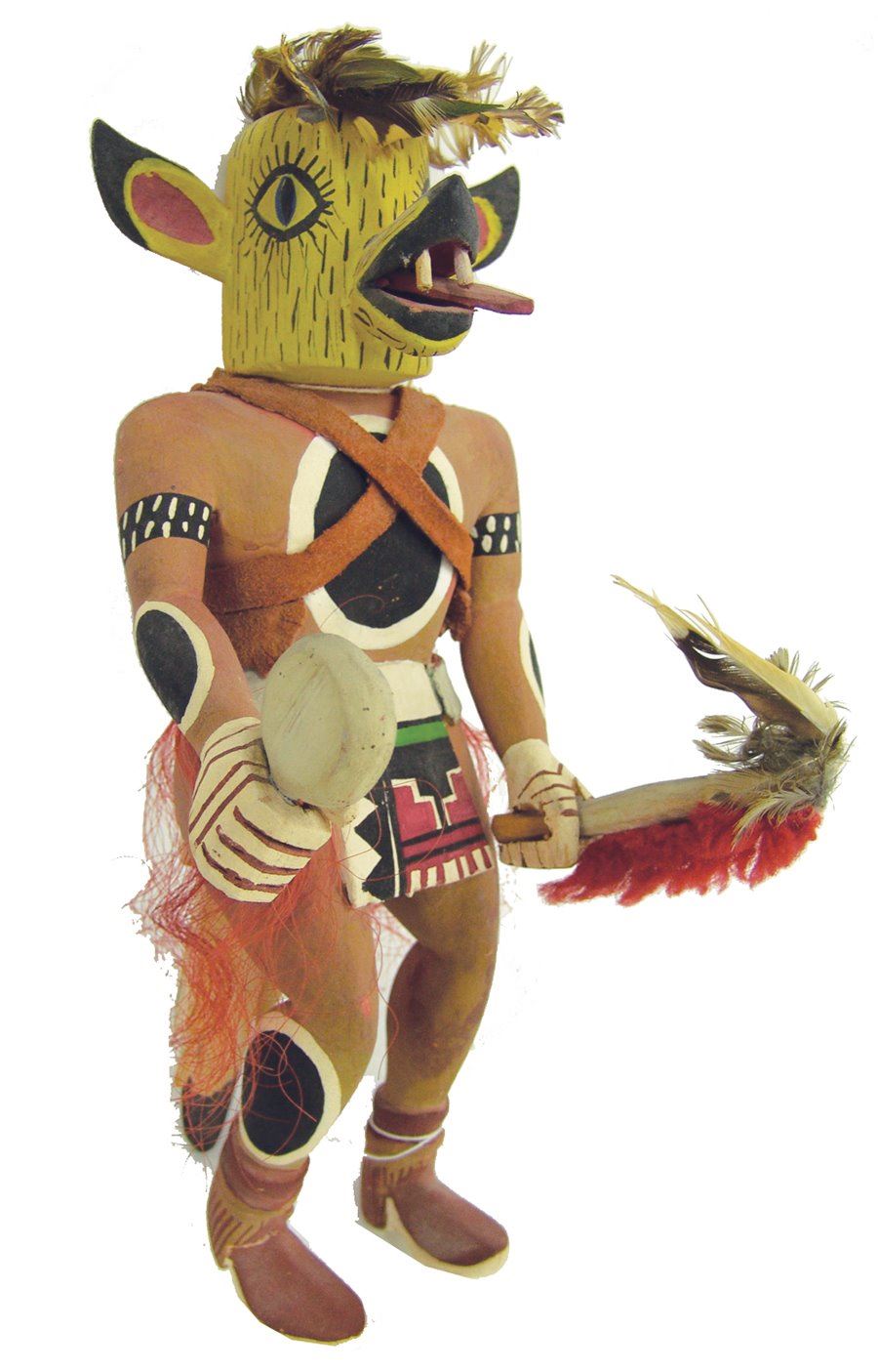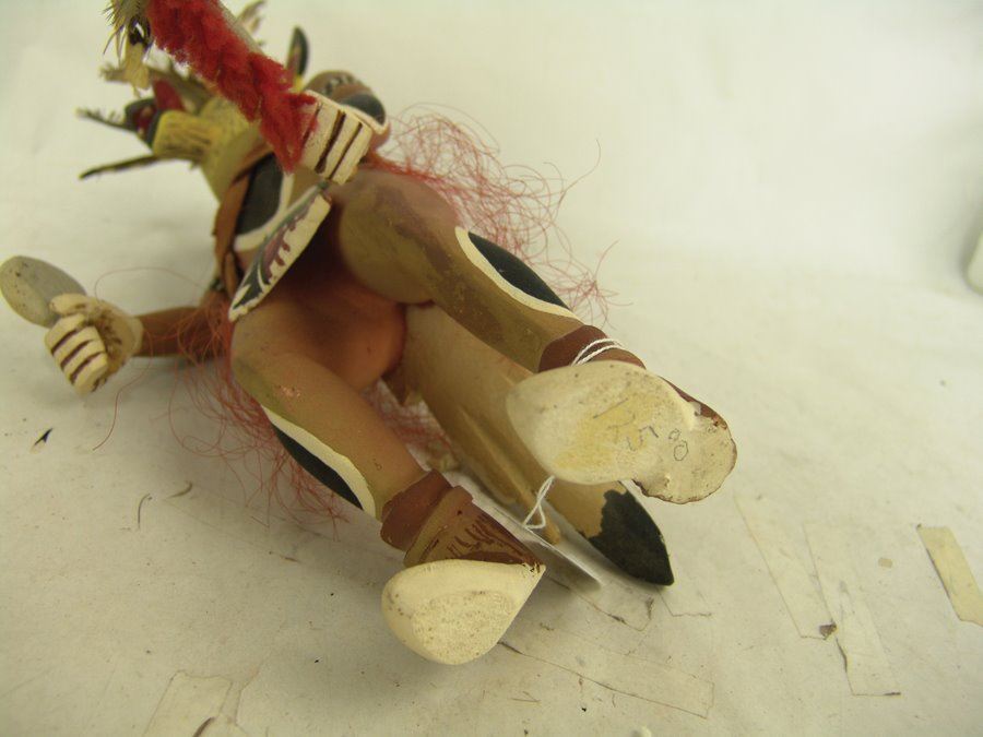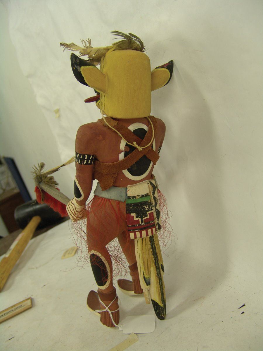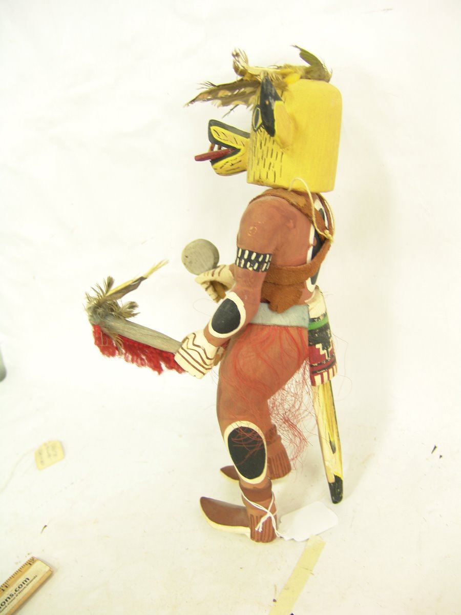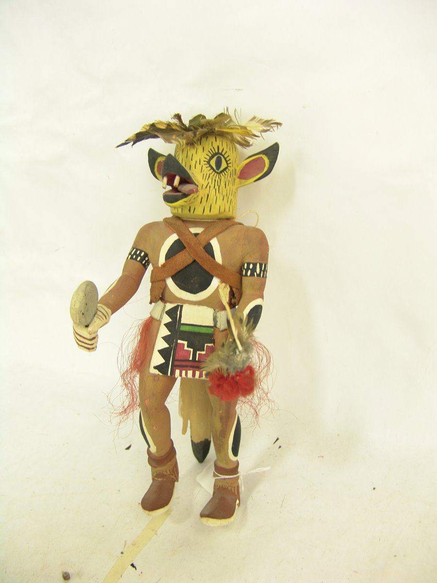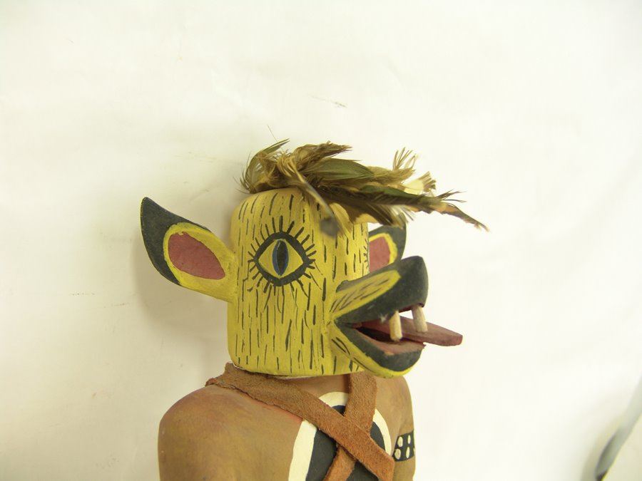 Rare, hand carved and painted cotton wood root Coyote kachina doll shown with dance wand, and rattle, and with it's tongue hanging out of it's mouth. Good condition, minor scuffs.,,12"