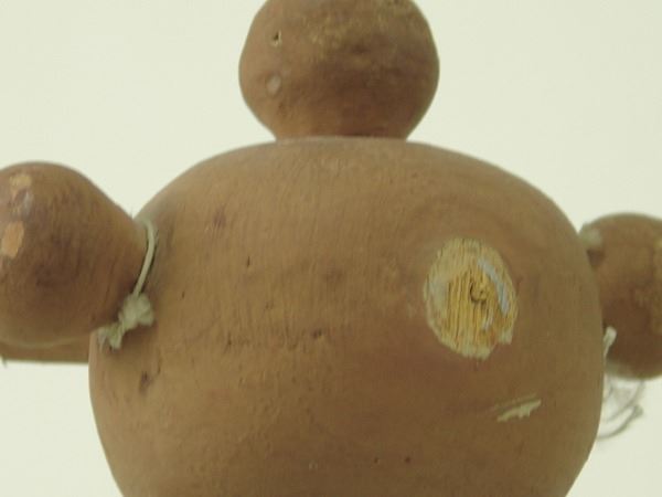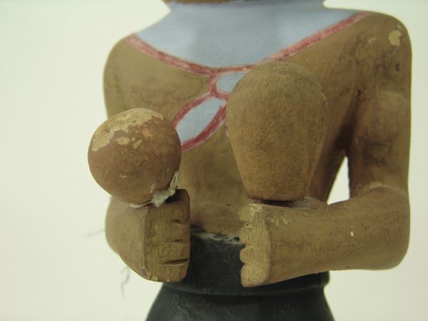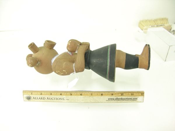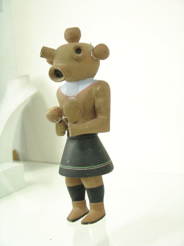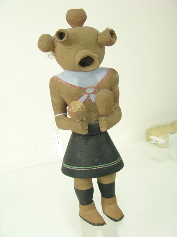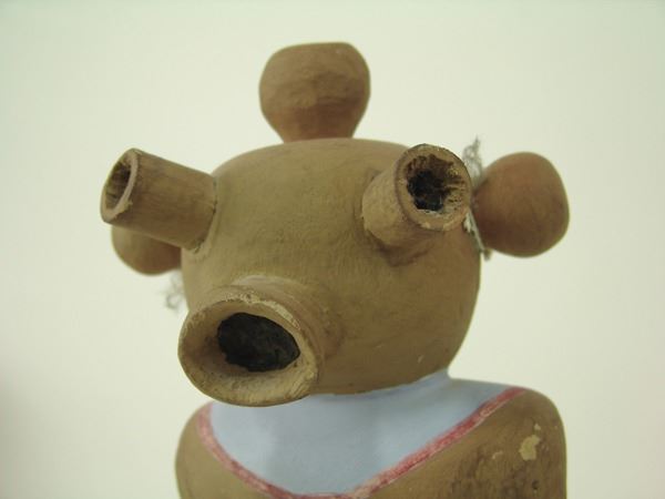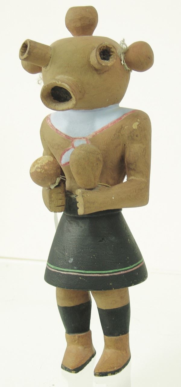 Early/Mid 1900s 14" Older, hand carved and painted, cotton wood root "mudhead" kachina doll with exaggerated eyes, mouth, and ears, and shown holding two dance rattles. Good condition.