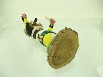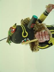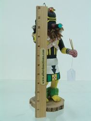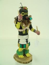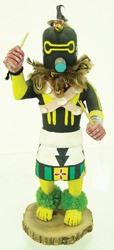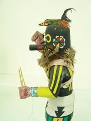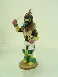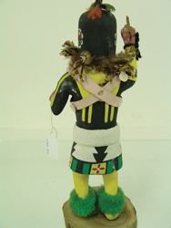 Traditional, hand carved and painted "Salimopia" doll with traditional motifs, including yucca staffs and shell bandolier. Good condition, minor repairs. Ca. 1980s. 13"