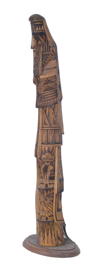 Nate Guy, Finely carved one-piece figure with very intricate story and design panels. 24" tall