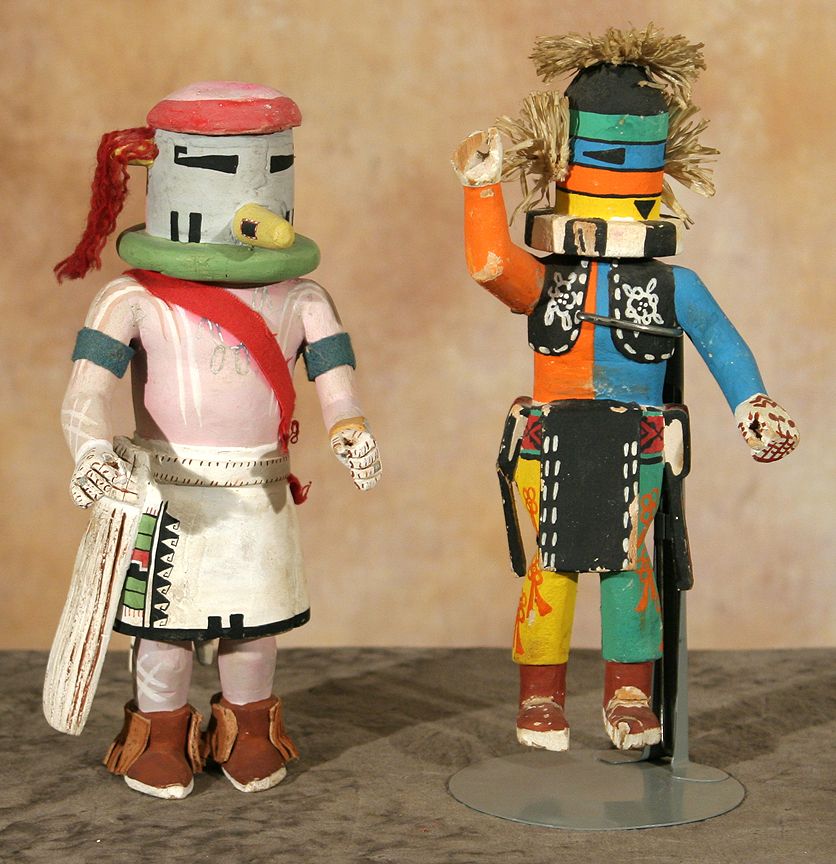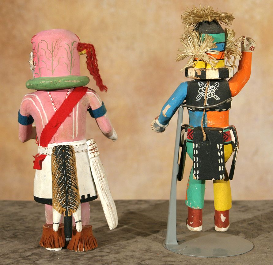 Pair of Hopi Kachina Carvings. Both are 11" tall, one is on a metal stand. Nicely carved & highly detailed-bright colors and accents. Mid 1900s. (est. $800-1,200). CONDITION REPORTS: www.auctioninsantafe.com/docs/cr2012.pdf