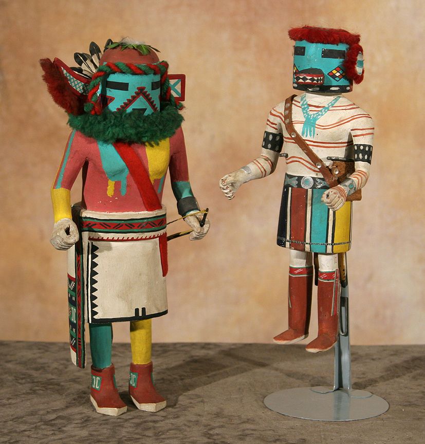 Pair of Hopi Kachina Carvings. One is 11" tall on a metal stand. The other is 13" tall & depicts a teapot dancer. Nicely carved & highly detailed with bright colors & accents in yarn, feathers & leather. Mid 1900s. (est. $800-1,200). CONDITION REPORTS: www.auctioninsantafe.com/docs/cr2012.pdf