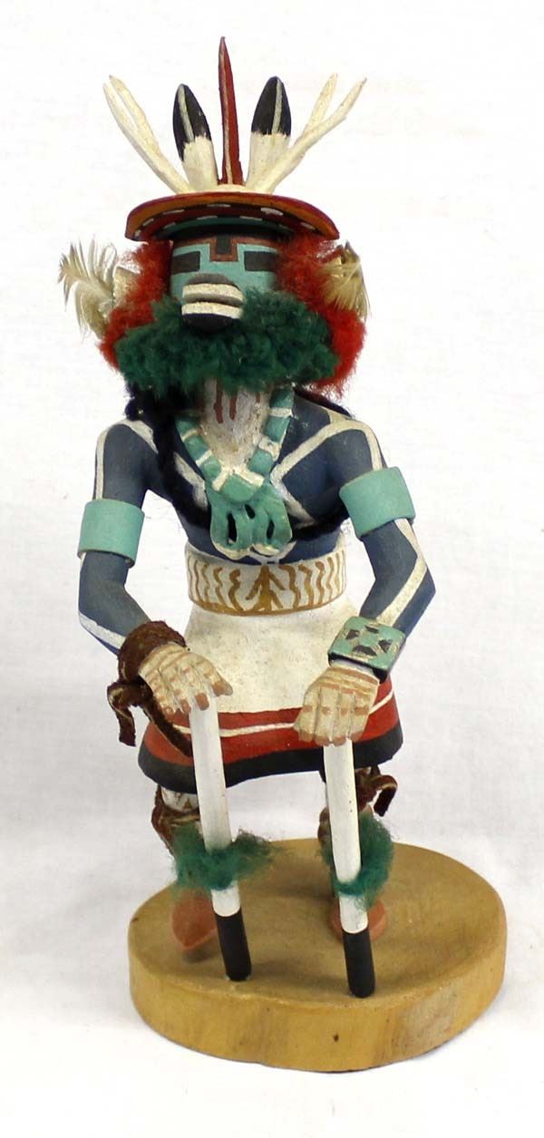 Native Native Kachina Deer Dancer by Alvan Nutumya of Hotevilla Village Arizona (1944-1983), measures 4'' x 10'' x 3'' and is signed on the bottom, embellished with feathers, yarn, and leather