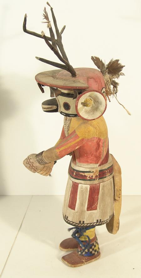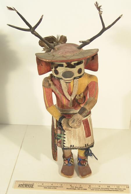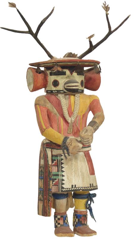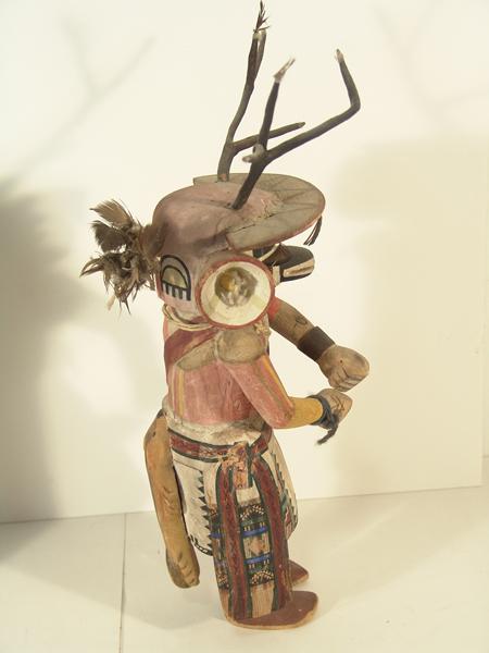 Outstanding early deer dancer doll with beautiful patina. Originally acquired by Eldon Brown who traded cottonwood root for it. Purchased from Arrowsmith in 1993 for $3,800; appraisal value $3,500. 18"
