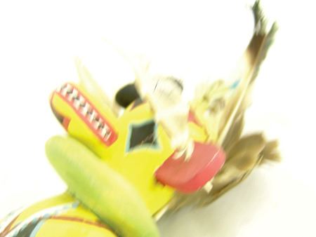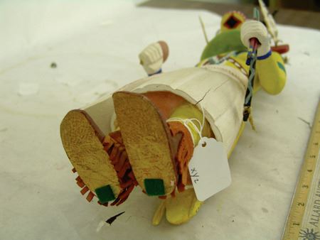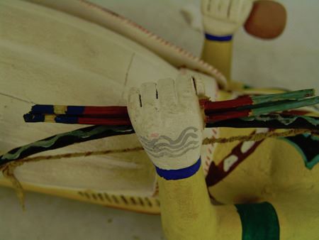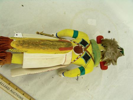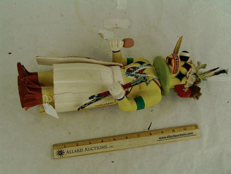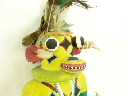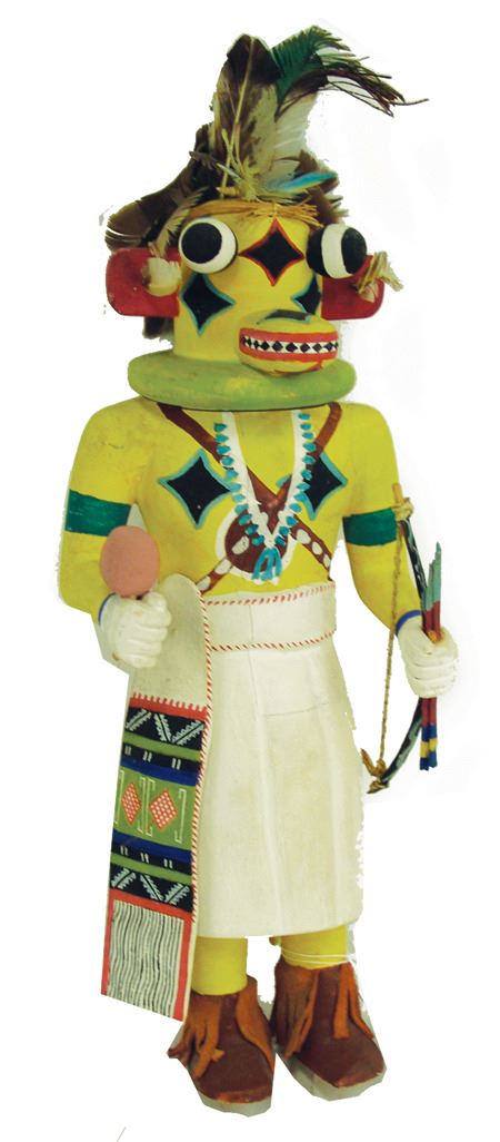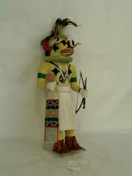 Mid 1900s, Beautiful traditional hand carved and painted cottonwood root yellow-masked "Hote" kachina with rattle in one hand, bow and arrows in the other. Very good condition. 14"