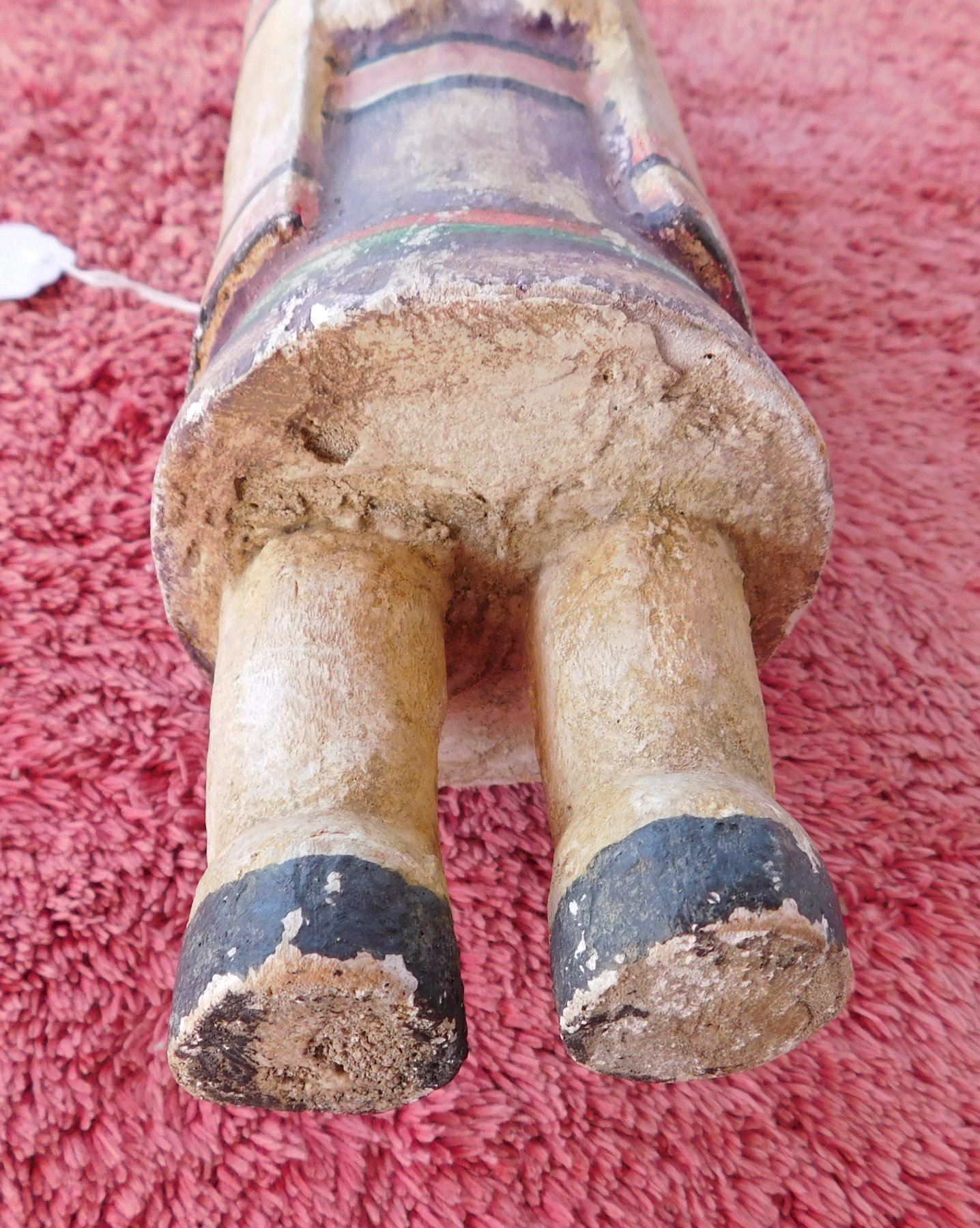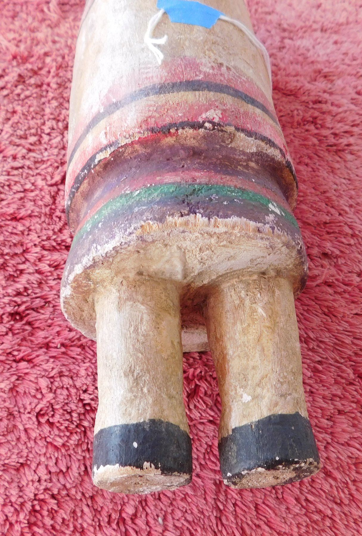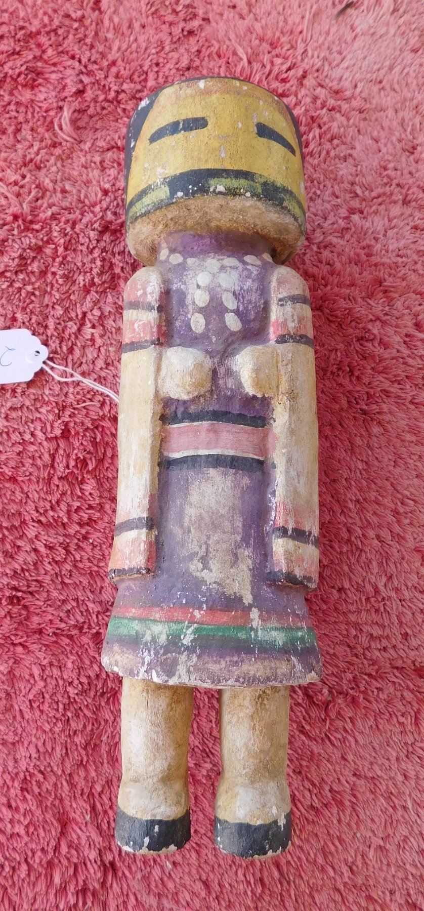 Hopi Kachina Doll, consignor reports item is late 19th century. Made of cottonwood and paint, the item measures 12" x 3.5". Arizona. Condition: Wear, scuffs, feathers gone, see images. Shipping: $25.50 w/insurance and signature.