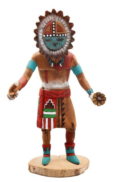 'Sun Face', signed on bottom. Kachina dolls are carved typically from cottonwood root by Hopi people to instruct young girls and new brides about the immortal beings that bring rain, control other aspects of the natural world and society, and act as messengers between humans and the spirit world.