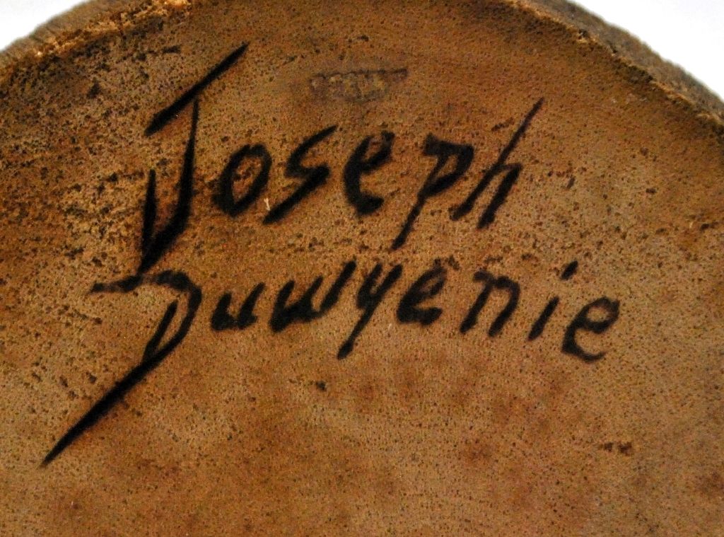 Measures 8" tall by 4-3/4" wide by 4" deep. Figure is carved by Hopi artist Joseph Duwyenie. One of a kind, the entire piece is carved from a single piece of cottonwood.