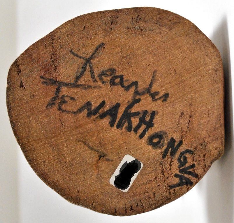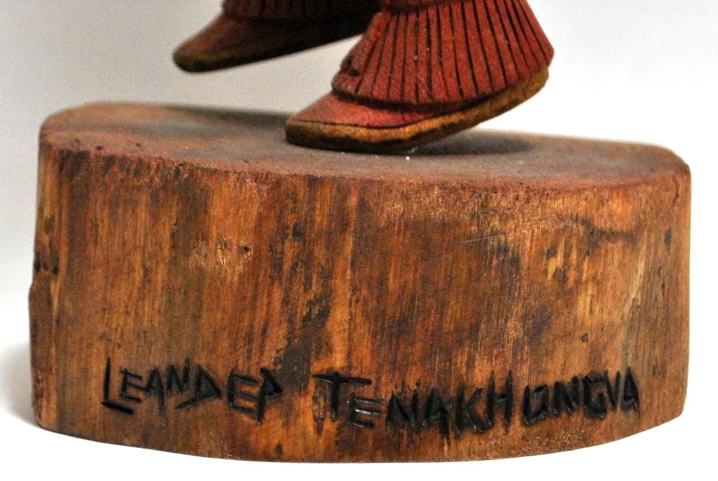 Measures 11" tall by 4" wide by 4-1/4" deep. Figure is carved by Hopi artist Leander Tenakhongva. One of a kind, the entire piece is carved from a single piece of cottonwood. NOTE: Artist signed name in marker on the bottom of the kachina (see picture). Can probably be sanded off if desired, but we are selling it as came to us.