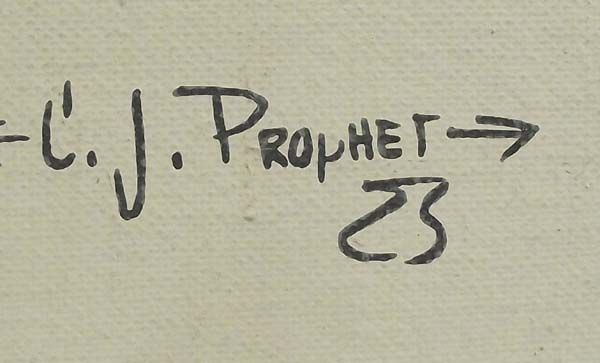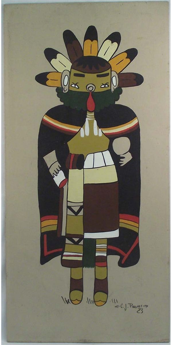Native American Hopi Kachina Painting on Board - C J Prophet. Painted on artist's foundation board, this kachina measures 12''x24''. Signed on lower right ''C.J. Prophet'' for Carol J. Prophet.