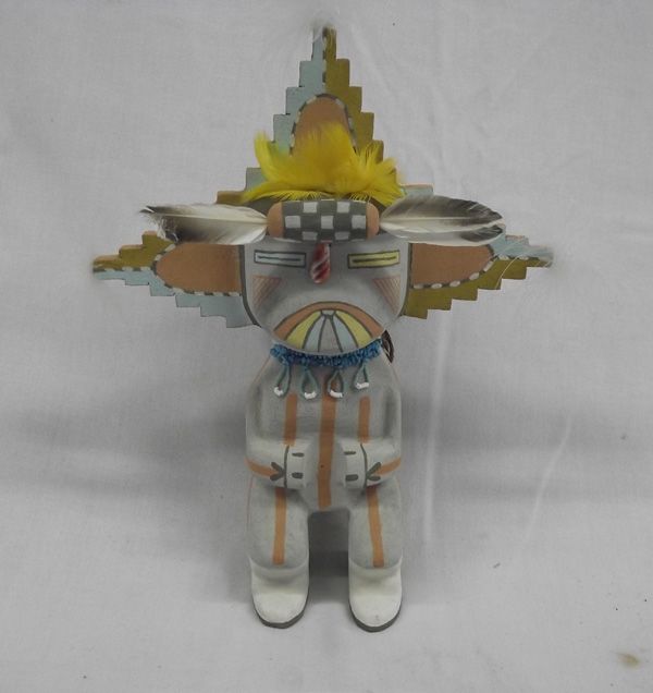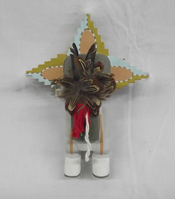 Hopi Kachina by Shalako Mana by noted Hopi Kachina Carver Wilbur Poleyestewa, measures 14'' x 13'' which includes feathers, beautifully handcarved and painted, feather and bead accessories, red and green yarn accent piece on back, phenomenal piece