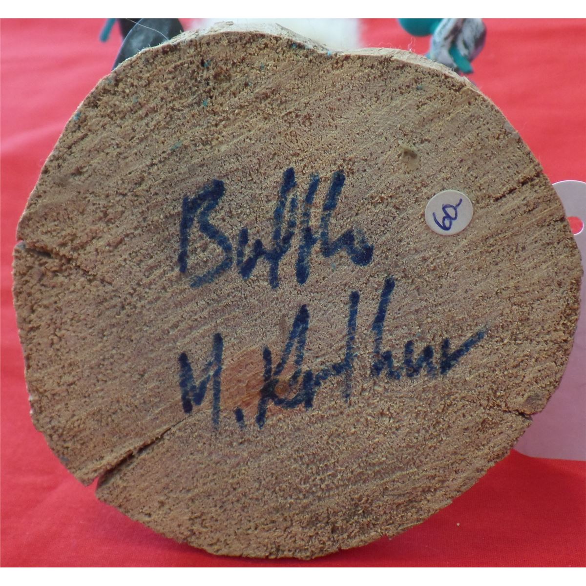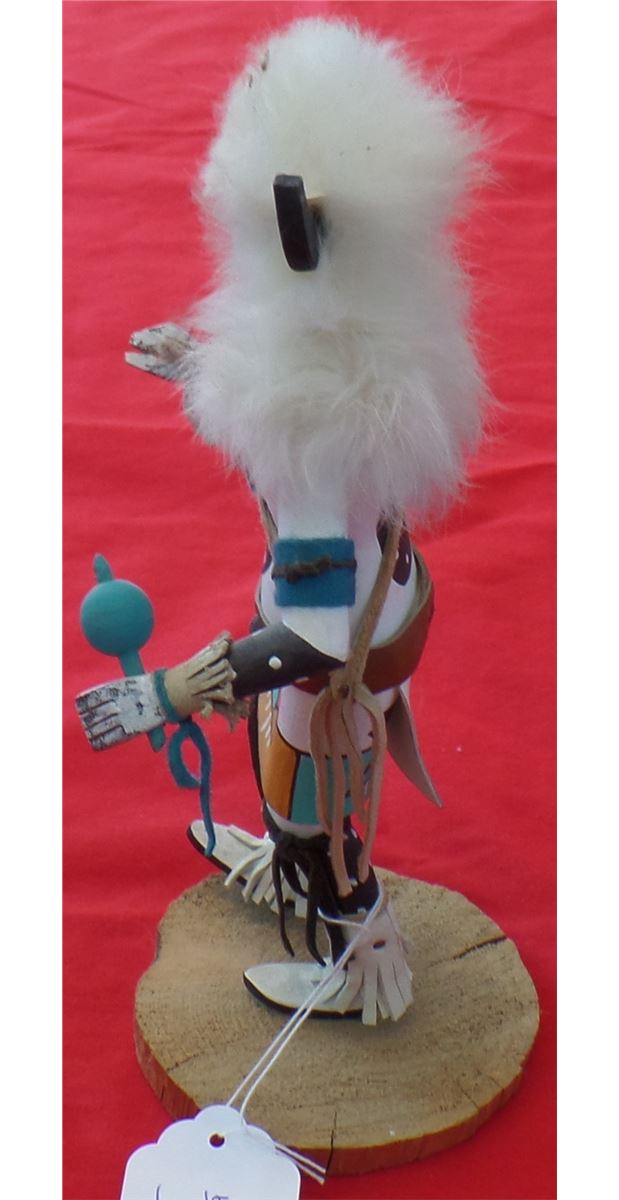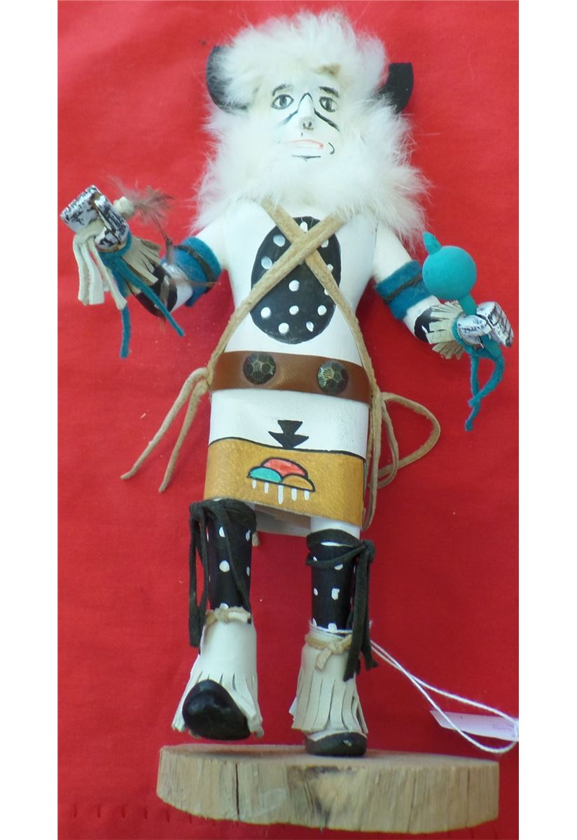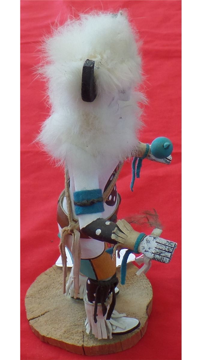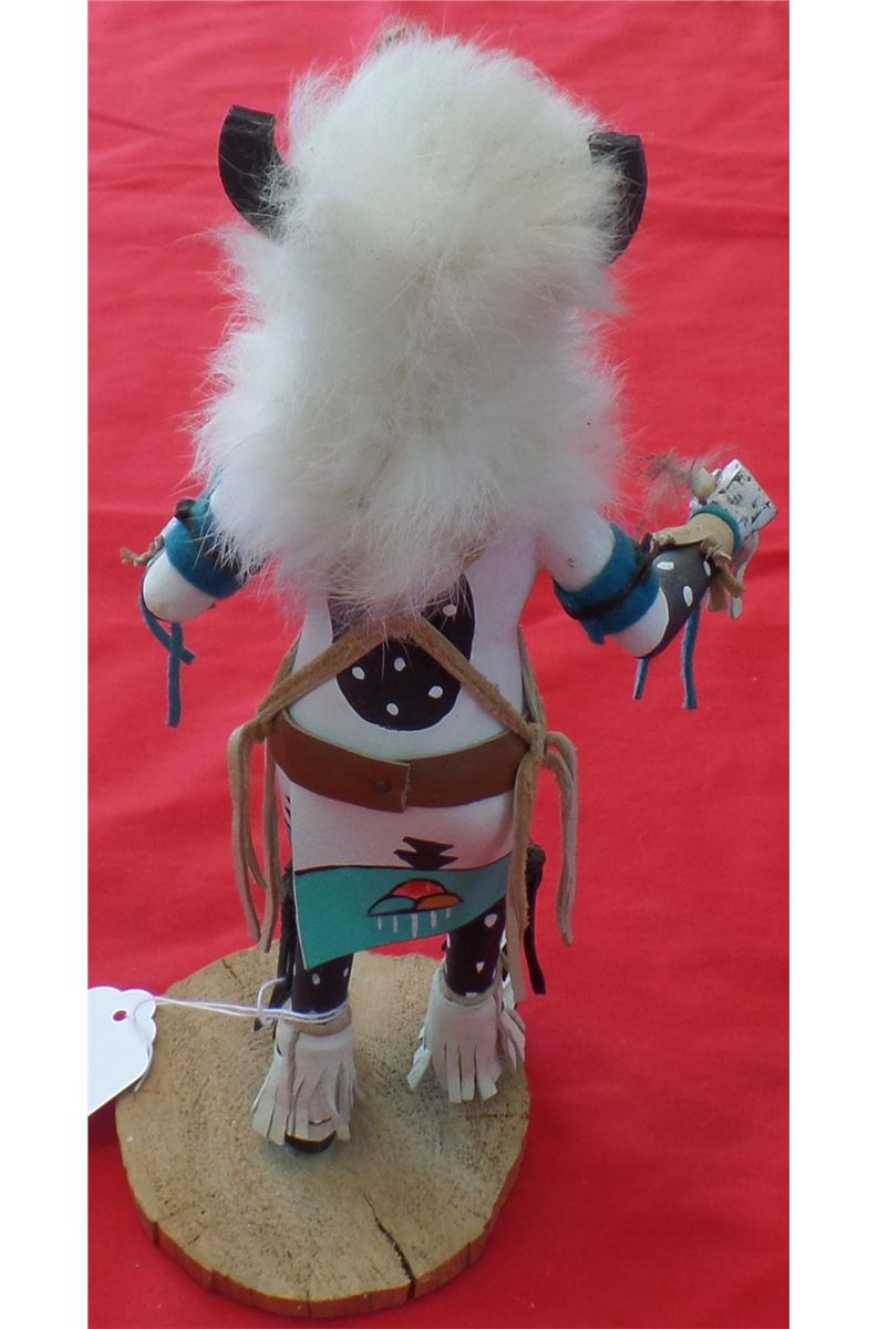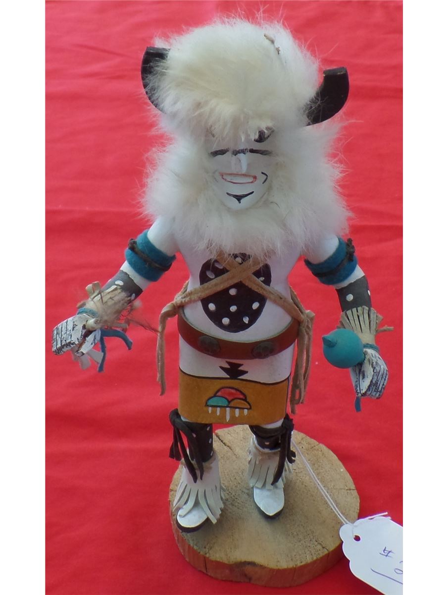 Hopi Kachina from the 1960s. Made of cottonwood, leather and feathers. Measures 10" x 5" x 4". Hopi, Central Arizona. Nice paint and design on this classic Kachina. Condition: Some damage to horns, signed. Shipping: $20.