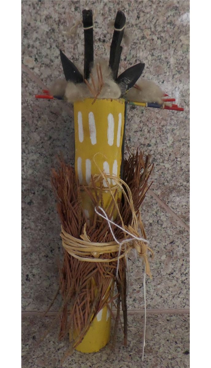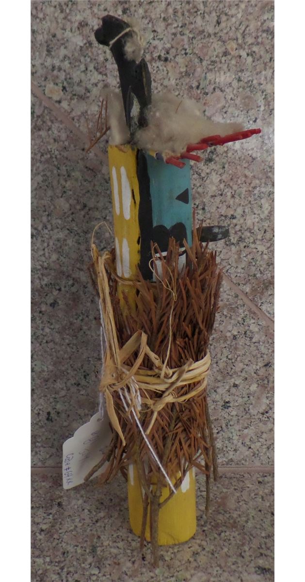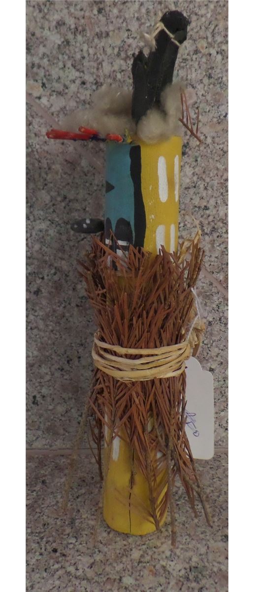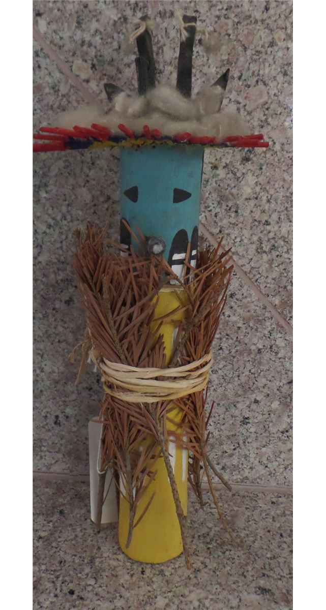 Older Hopi Kachina made from Cottonwood, paint, fern and everygreen grass. There are minor nicks and scrapes and the Evergreen branches have turn brown over the years. This Kachina is approximately 11 inches tall and 5 inches wide. It is in good condition for an older piece. Shipping $16.00