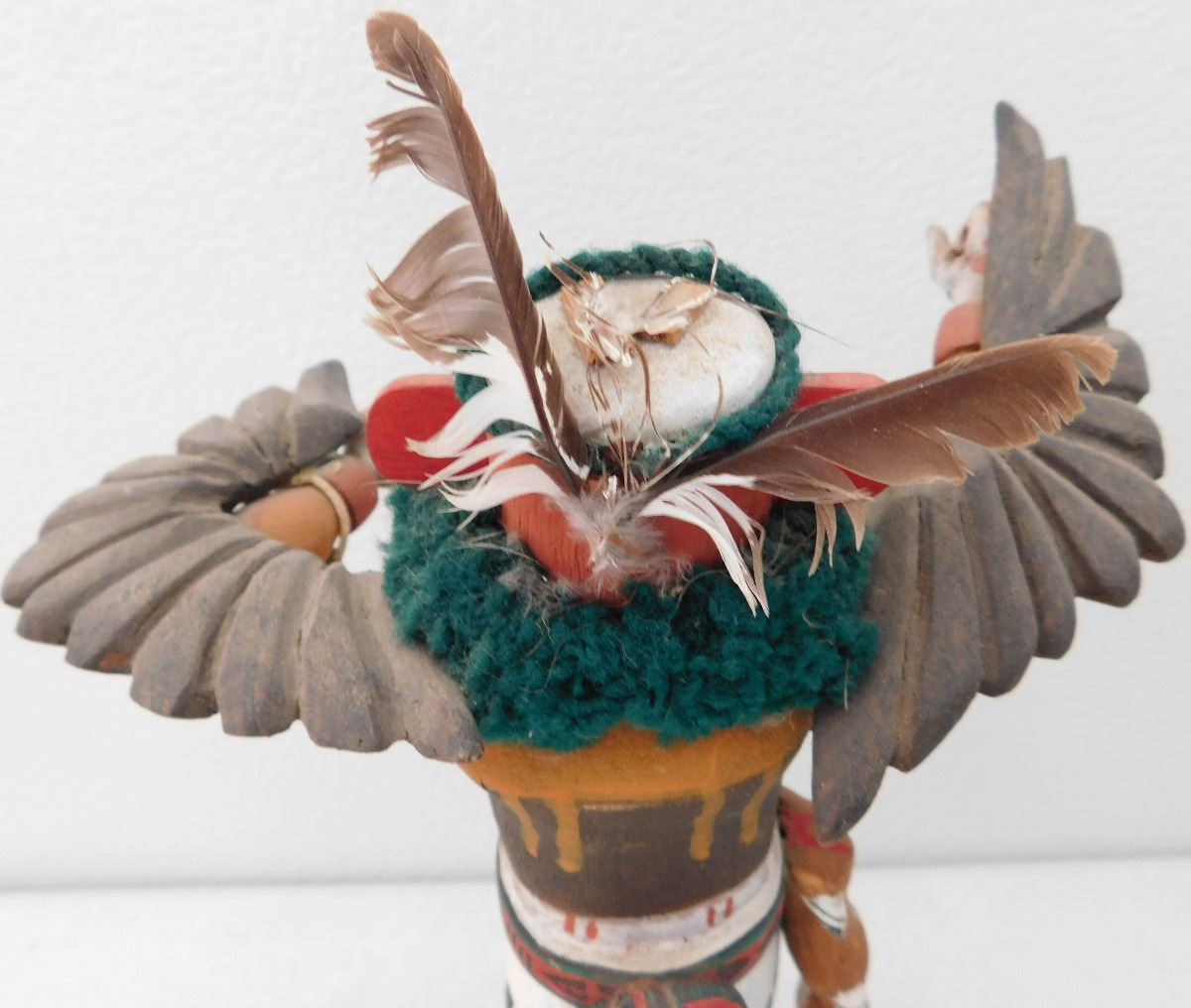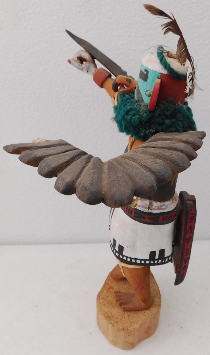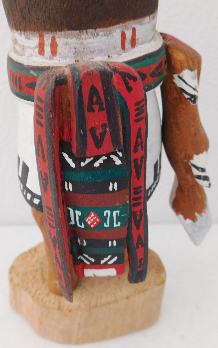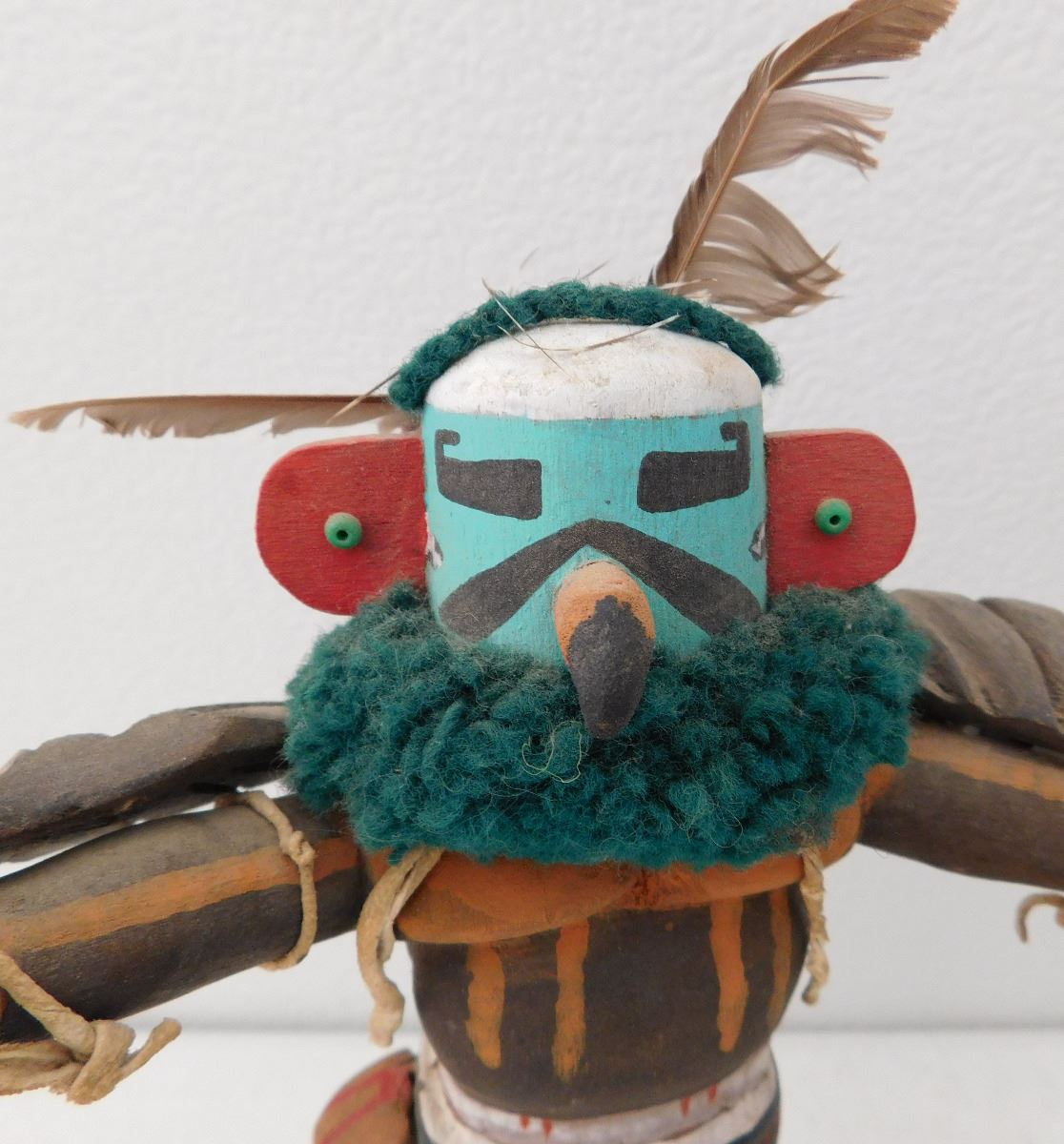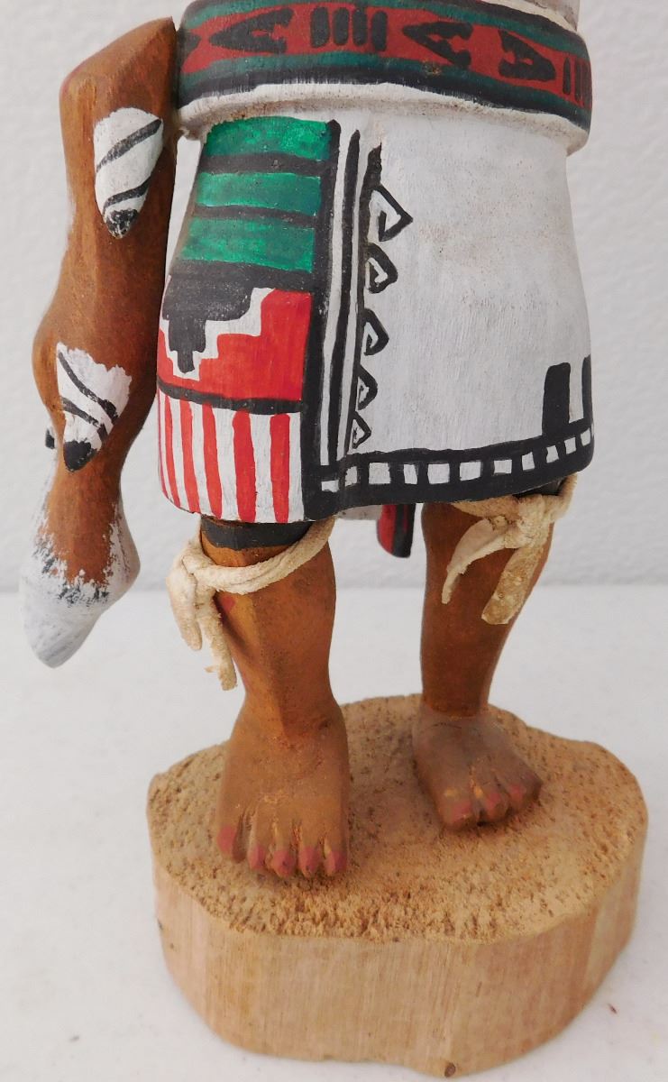 Hopi Kachina, circa 1940s. Made of cottonwood, paint, leather and feathers, this item measures 8.5" x 5.5" x 12". Hopi, Northern-central Arizona. Note the fox cadaver that hangs from the figure's belt. Condition: Very good, dusty, see images. Shipping: $28.00, requires double-box w/insurance.