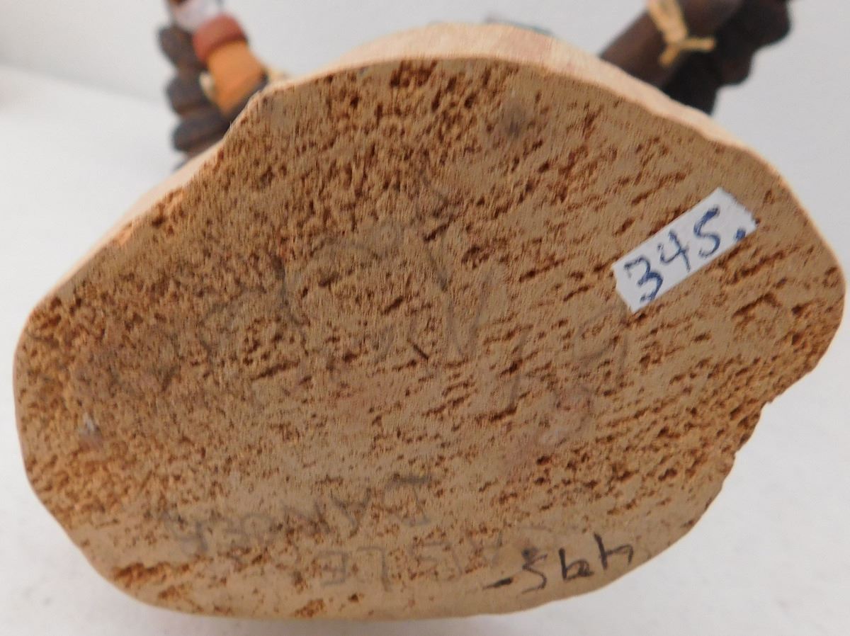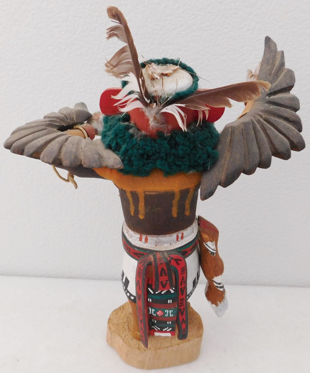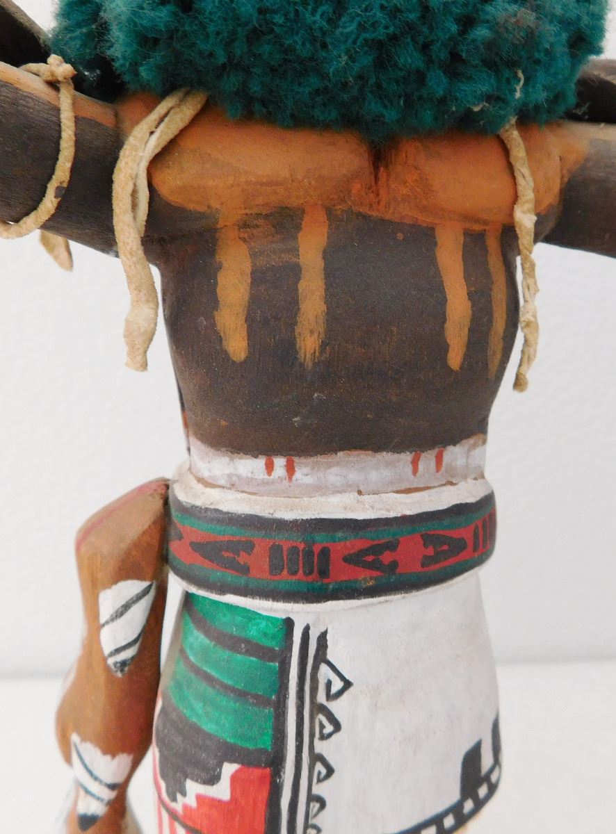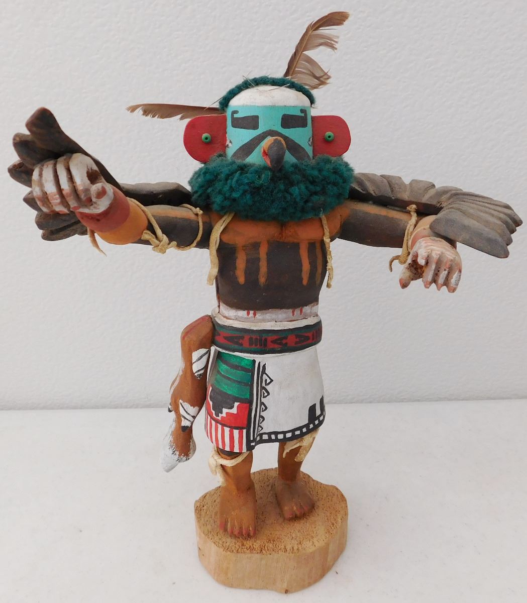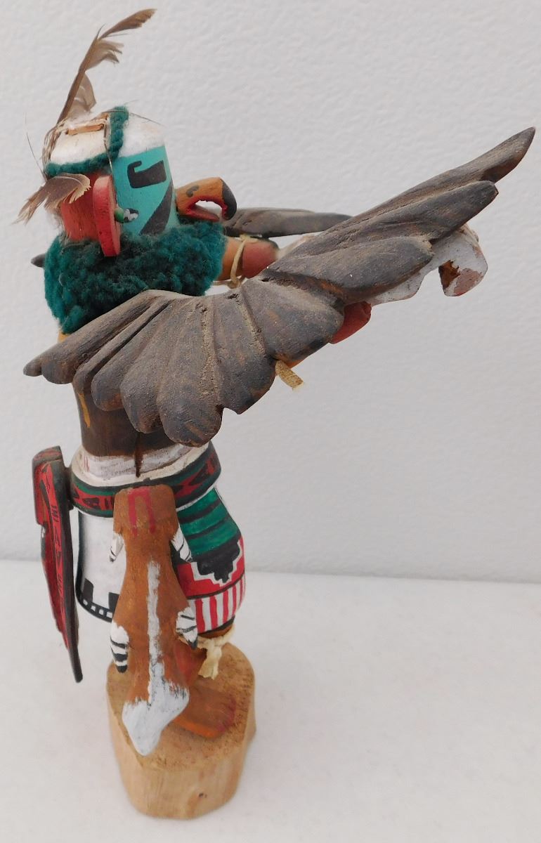 Hopi Kachina, circa 1940s. Made of cottonwood, paint, leather and feathers, this item measures 8.5" x 5.5" x 12". Hopi, Northern-central Arizona. Note the fox cadaver that hangs from the figure's belt. Condition: Very good, dusty, see images. Shipping: $28.00, requires double-box w/insurance.