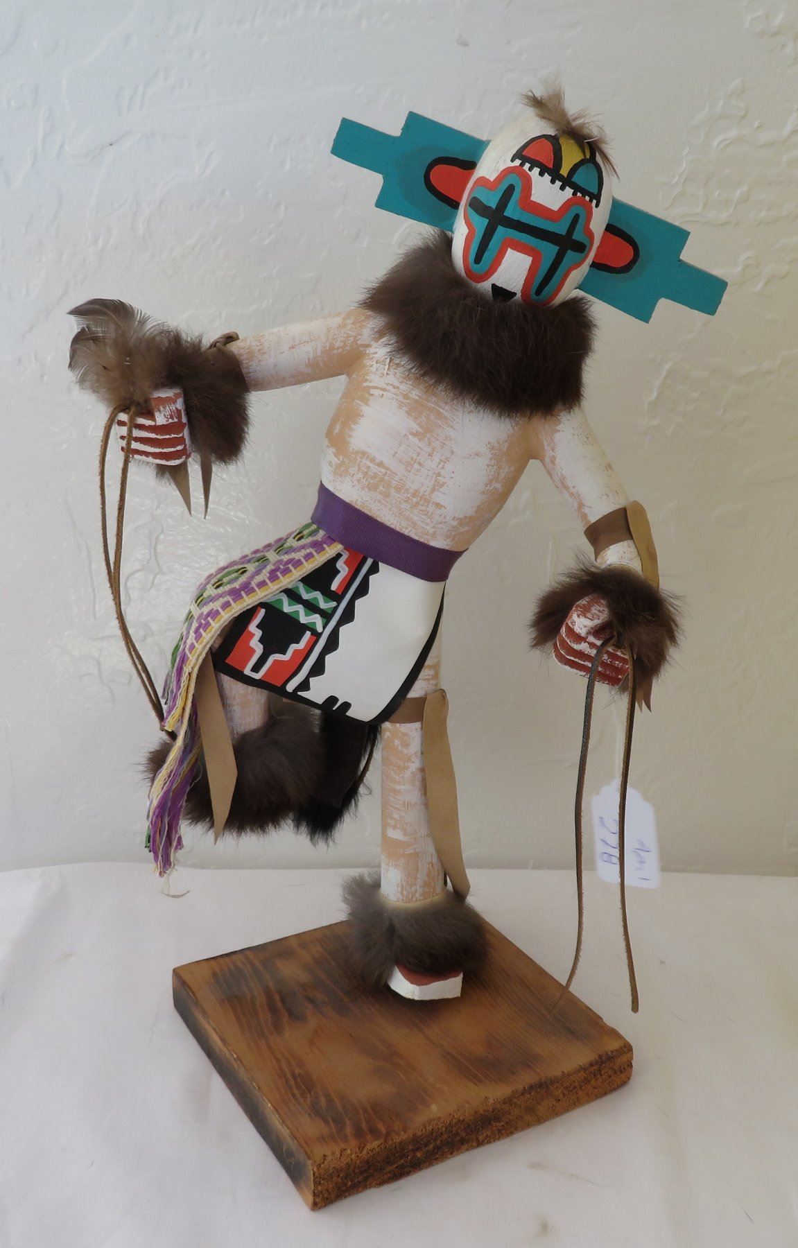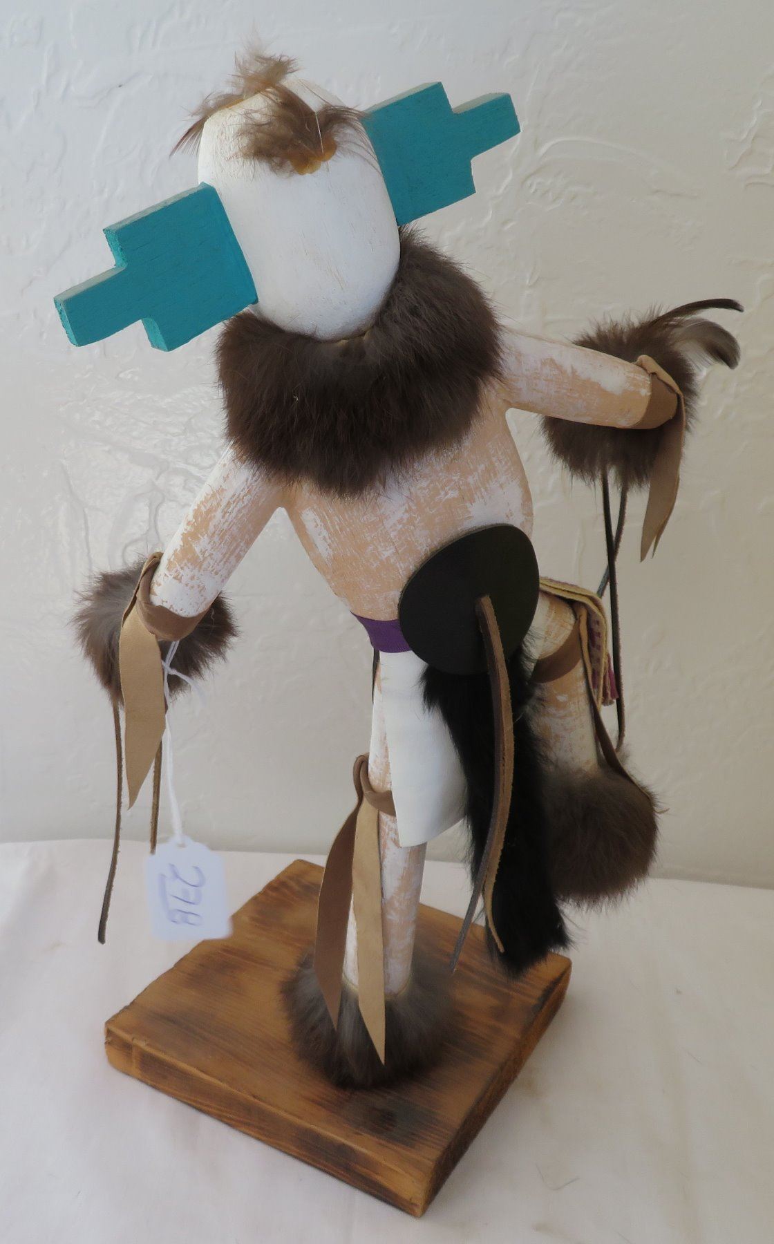 Hopi Kachina, 20th century item. Made of cottonwood, paint, fur, feathers, cloth fibers, the item measures 9" x 15". Hopi, Arizona. Signed on bottom by artist, "Chaleur", Tawa Her (?). Nice kachina on stand. Condition: Good, some wear, see images. Shipping: $26.50 w/insurance and signature, due to size.