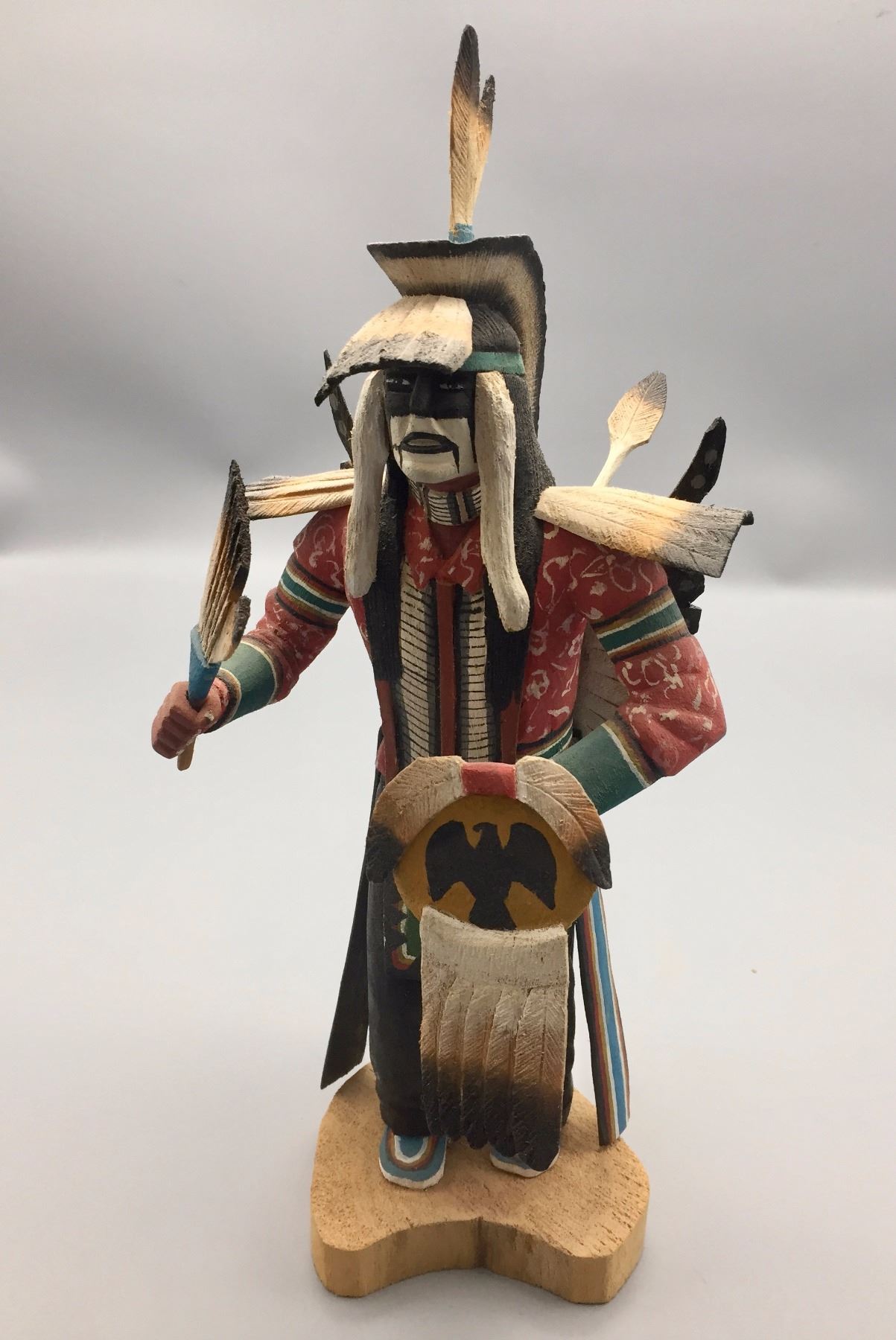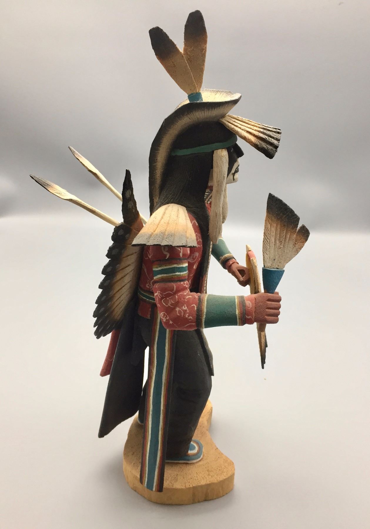 Maker: Pat Howesa. Approx. Age: Fairly Modern. Size: Measures 15” h x 6 1/2” l x 7 1/4” w. Additional Info: Finely carved Hopi style Kachina. Condition: Pretty good, but some spots do show signs of repairs and gluing Please look closely at the pictures - they are an important part of our description. Shipping: There will be a $8 handling / packaging fee for shipping this lot. The actual cost of postage will be added on top of that.