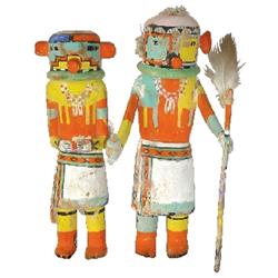 Hopi Kachinas (2); cottonwood w/colorful water based paint, pre-1940, one is missing ear, otherwise in VG original condition, ea. 9"H.