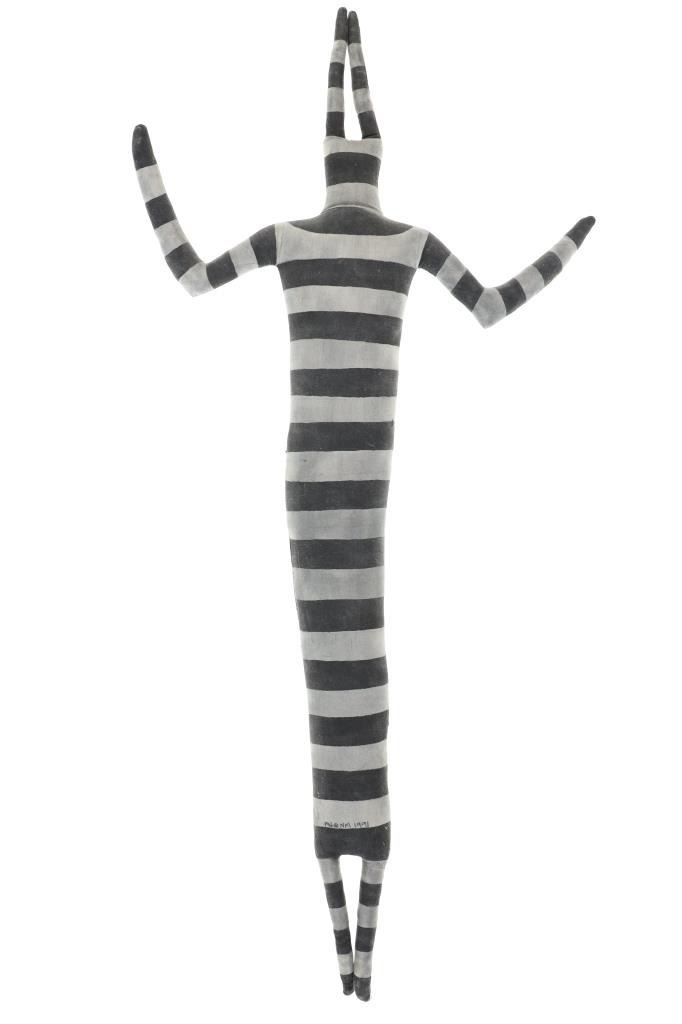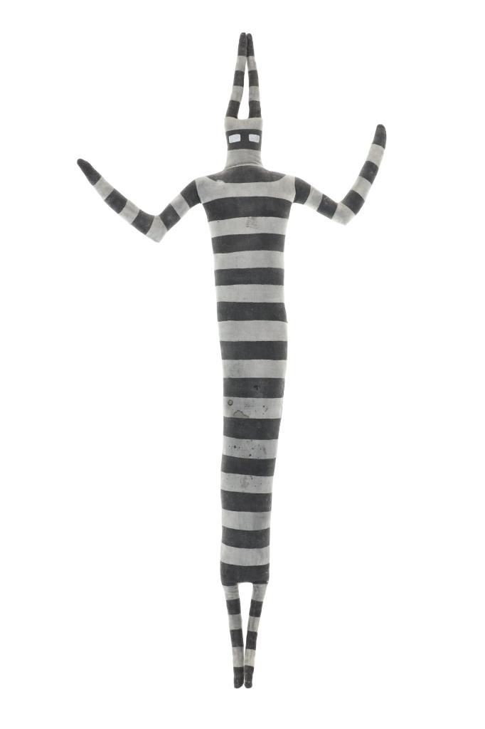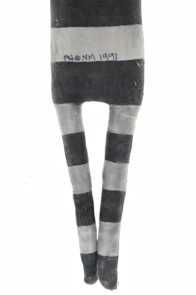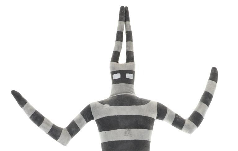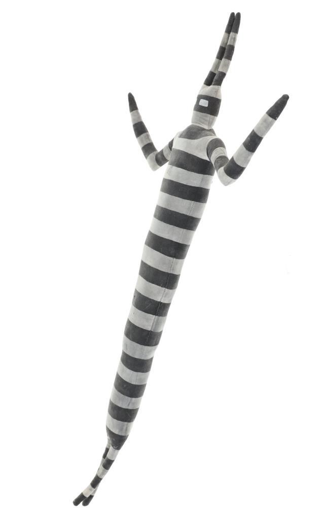 Featured in this lot is this Hopi Koshare Hano Clown Kachina doll circa 1950's. The Kachina doll is wonderfully and professionally crafted fabric and is stuffed construction that shows the traditional Koshare Hano Clown Kachina design with the two feelers and the long body with short legs and long arms. The entire doll is colored black and white with horizontal stripes and shows the eyes as white or otherworldly. This Hopi Indian sacred clown kachina is associated with fertility, rain, sun, corn and corn pollen, associations that give him power. The condition of this stuffed Kachina doll is preserved with some fading to the dyes of the fabric of the doll and shows some wear from the age of the doll but otherwise is in preserved condition. The measurements of this Kachina doll is 29" x 14" x 2 1/4". The collective weight of this Kachina doll is 8oz.