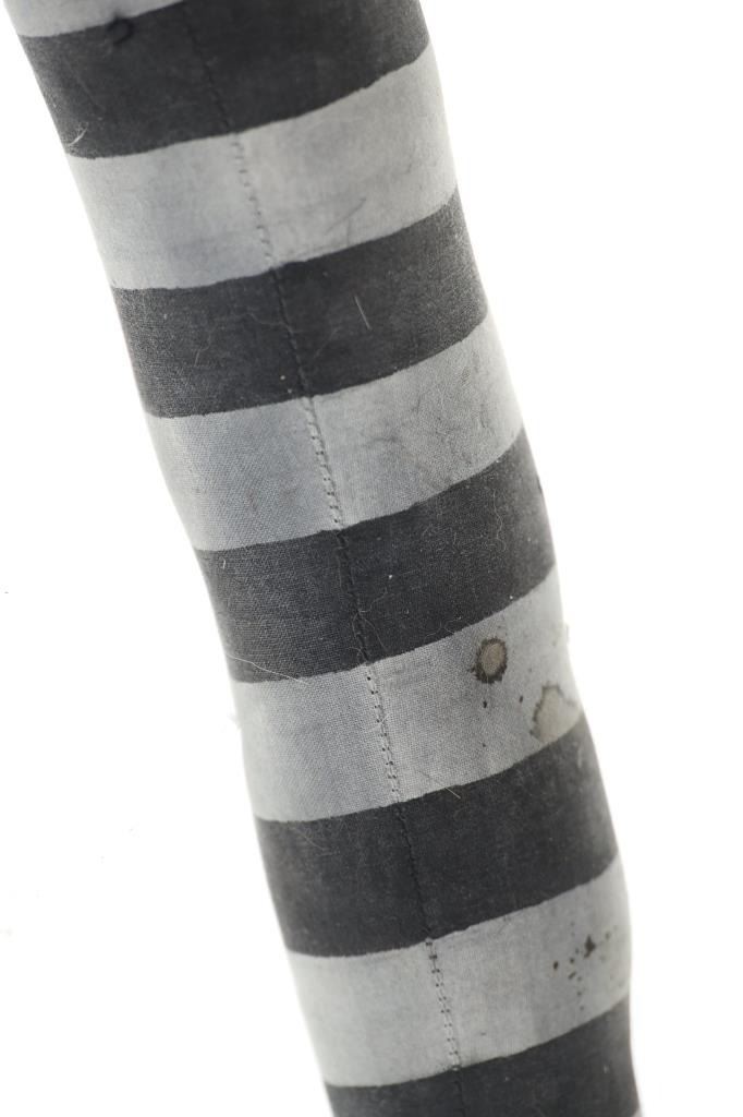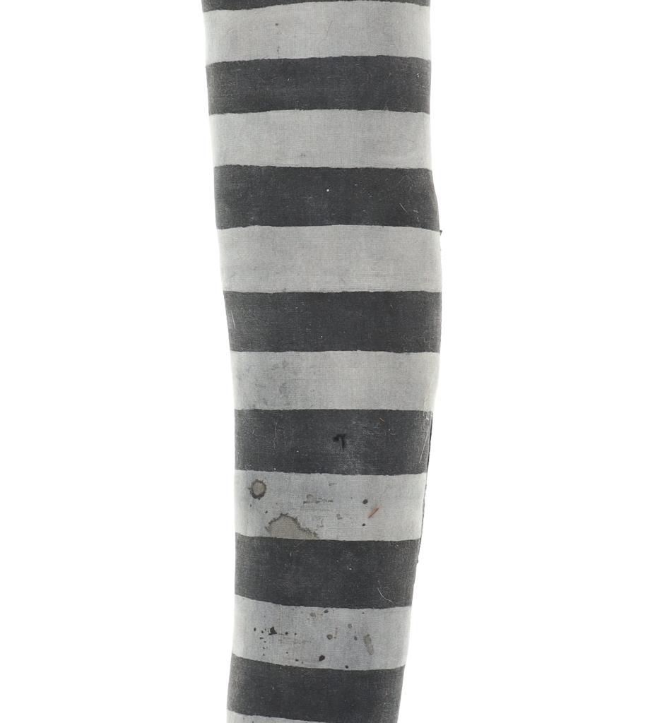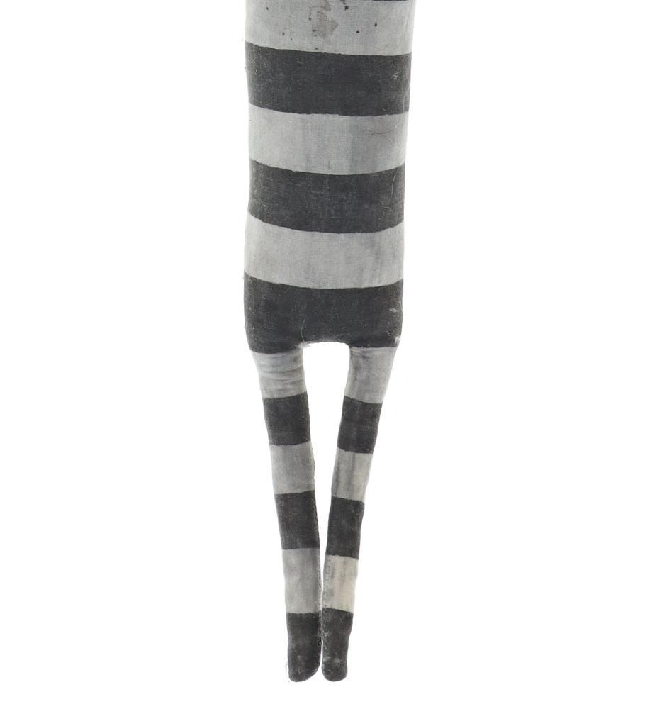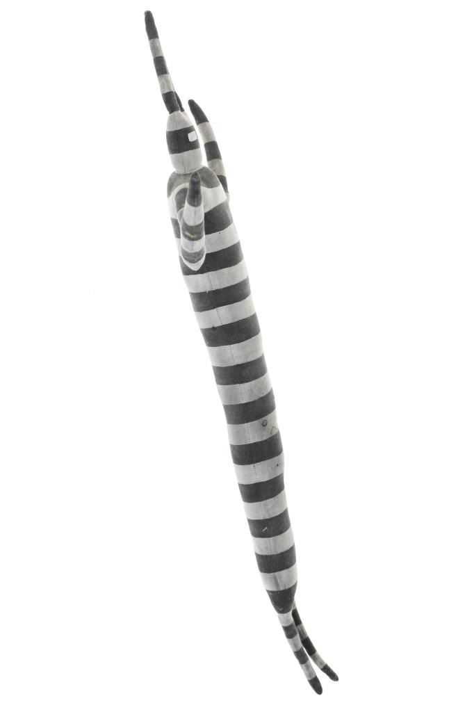Featured in this lot is this Hopi Koshare Hano Clown Kachina doll circa 1950's. The Kachina doll is wonderfully and professionally crafted fabric and is stuffed construction that shows the traditional Koshare Hano Clown Kachina design with the two feelers and the long body with short legs and long arms. The entire doll is colored black and white with horizontal stripes and shows the eyes as white or otherworldly. This Hopi Indian sacred clown kachina is associated with fertility, rain, sun, corn and corn pollen, associations that give him power. The condition of this stuffed Kachina doll is preserved with some fading to the dyes of the fabric of the doll and shows some wear from the age of the doll but otherwise is in preserved condition. The measurements of this Kachina doll is 29" x 14" x 2 1/4". The collective weight of this Kachina doll is 8oz.