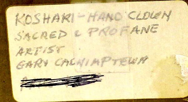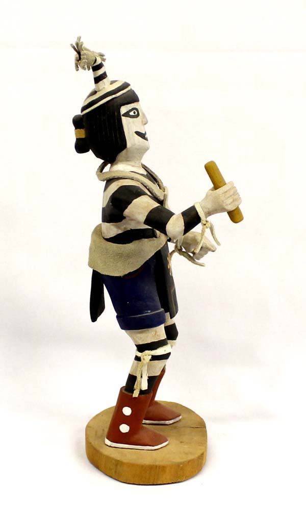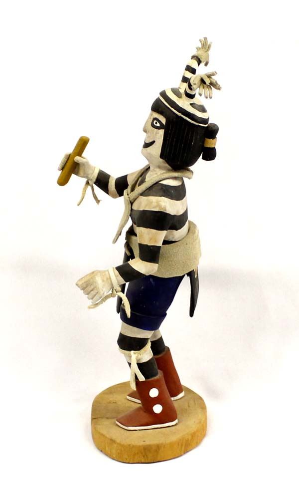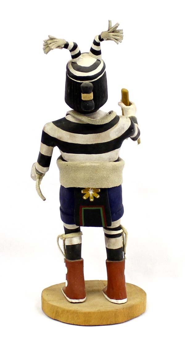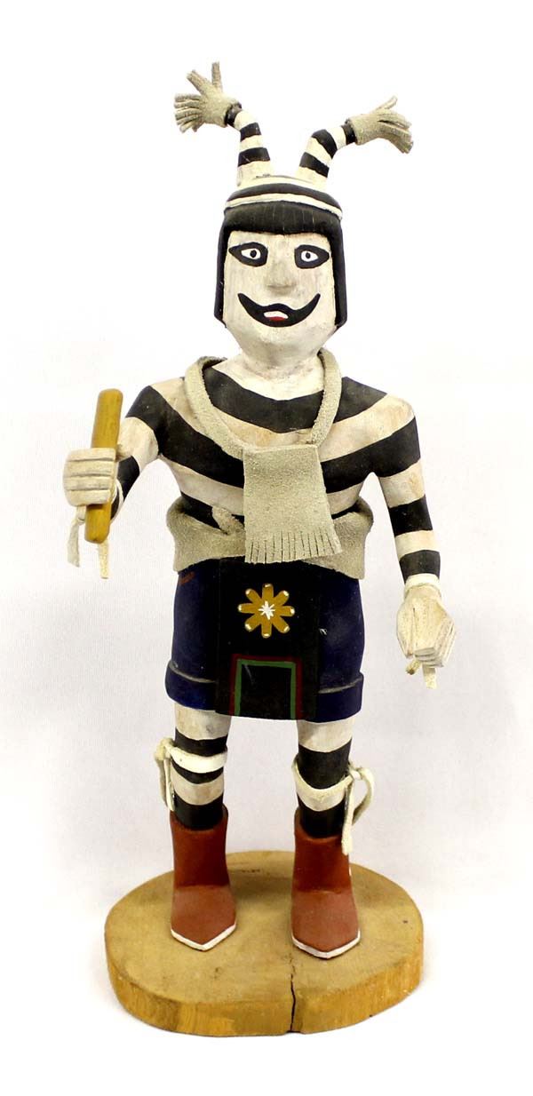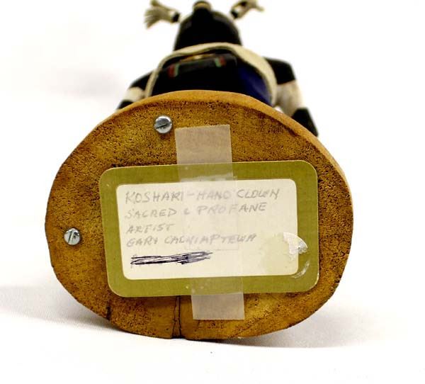 Vintage Native American Hopi ''Koshari Hano Clown (Sacred & Profane)'' Kachina by Gary Calnimptewa, signed by artist and measures 12''H x 4.5''W x 5''Deep, embellished with leather