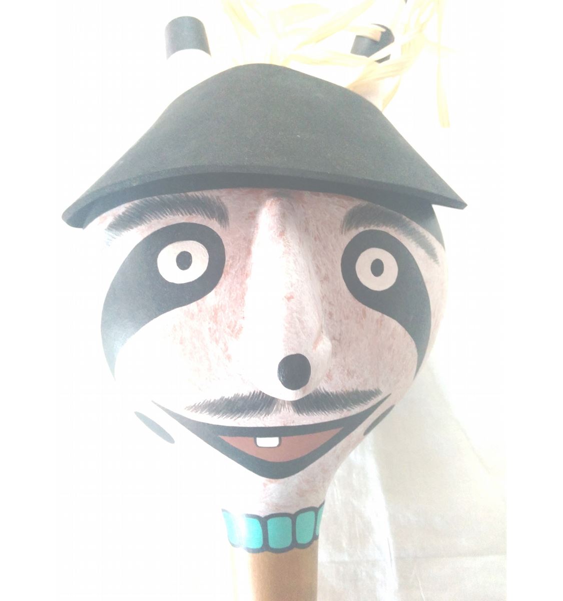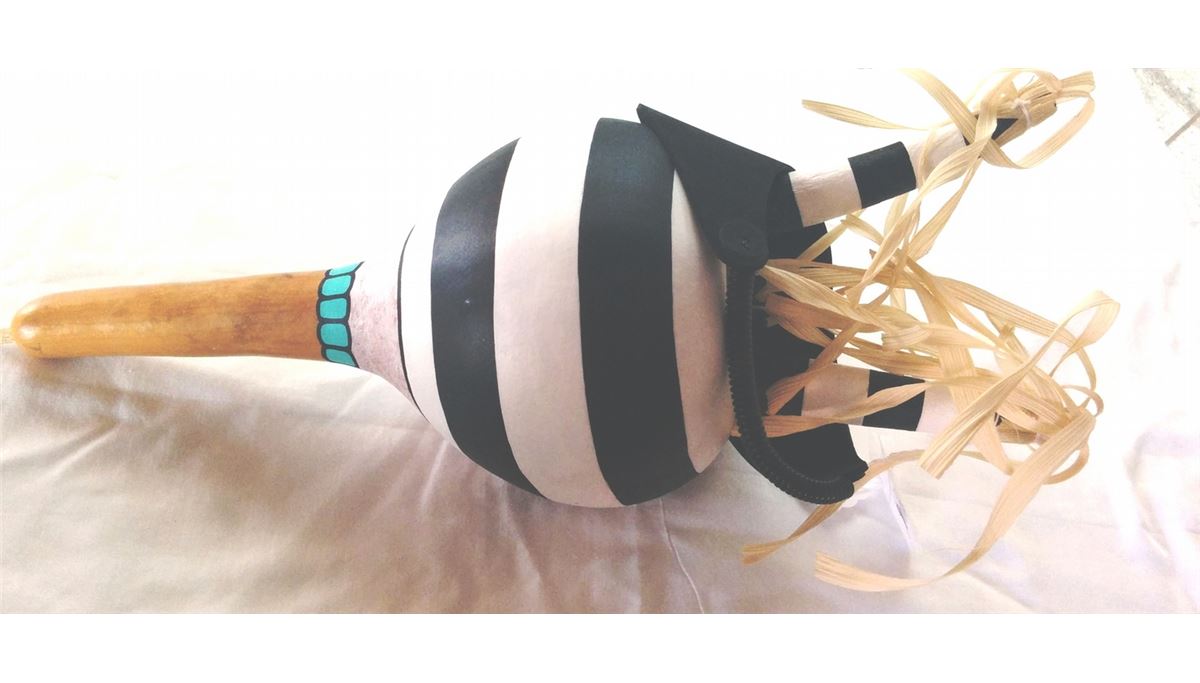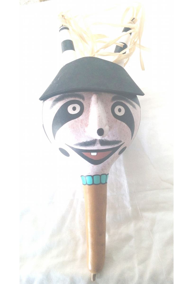 Hopi Koshare Rattle is from the 1990's . The item is made of gourd, a visor, and paint. It measures approx. 17" x 8" x 7". Hopi Koshare Rattle is from Northern Arizona. Nicely painted gourd Koshare with one tooth! Rattle has a nice sound. Condition: Very good condition, see images. Shipping: $24.00.