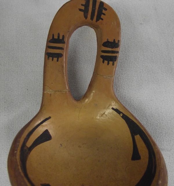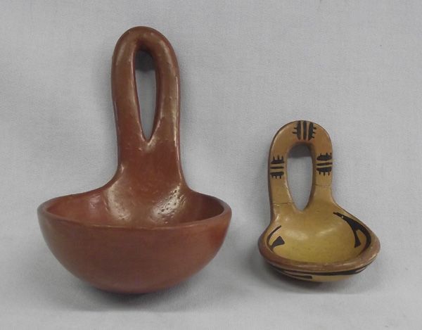 Hopi Ladles, largest measures 5.5''H x 4''W, two traditional pottery Hopi ladles, largest has chip on rim, the smaller one's handle has been glued